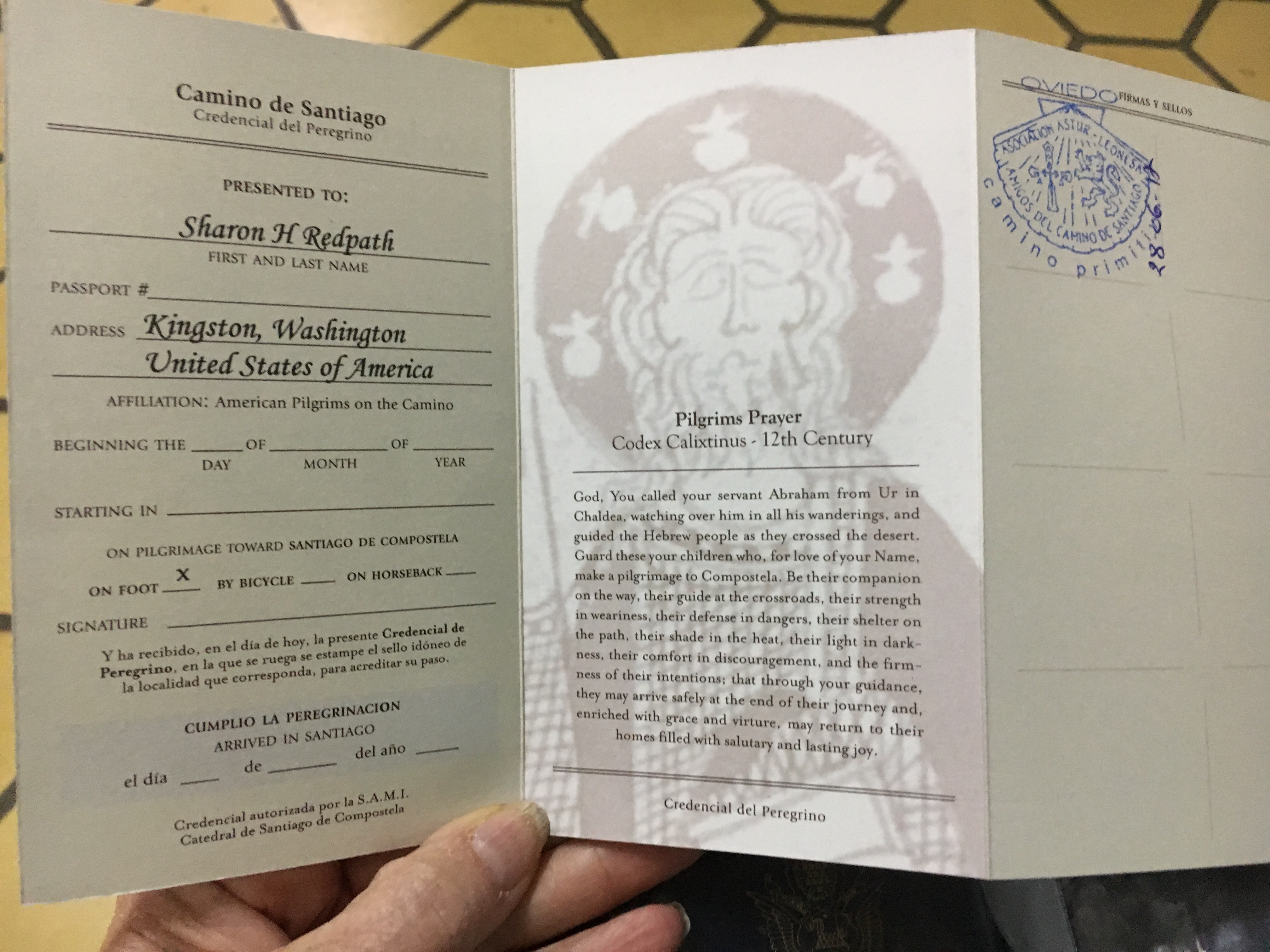 But it was a breeze getting thru the Madrid airport and onto the metro over to the bus station. After some confusion we finally deduced where to catch our bus to Oviedo, where we’ll start our hike. It was a beautiful ride through farmlands and rolling hills and then into the mountains. Lost track of how many tunnels we went through. Alighted from the bus in a drizzle and opted for a cab ride over to the pilgrim Alberge (hostel), where I got my first stamp!