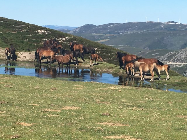 We began in fog, walking along a road for several km before hitting a trail path. After another few km a decision had to be made: either the hospitales high route or the pola de allande lower route. I knew that Mandy really wanted to do the high route as the views were supposed to be spectacular. I was just concerned if I could do 17 miles of steep climbs then the associated downhills. Also, there were no services at all along the entire way. We had stocked up on food and water so we decided to give it a go. We climbed until we got above the clouds and it truly was spectacular. Views for miles and miles of all the mountains with farms and villages far below. We passed many cows with a good number of calfs as well as lots of beautiful horses with ponies. At one spot we stopped for a rest and snack and several horses came right up to us looking for a handout. We did not share.