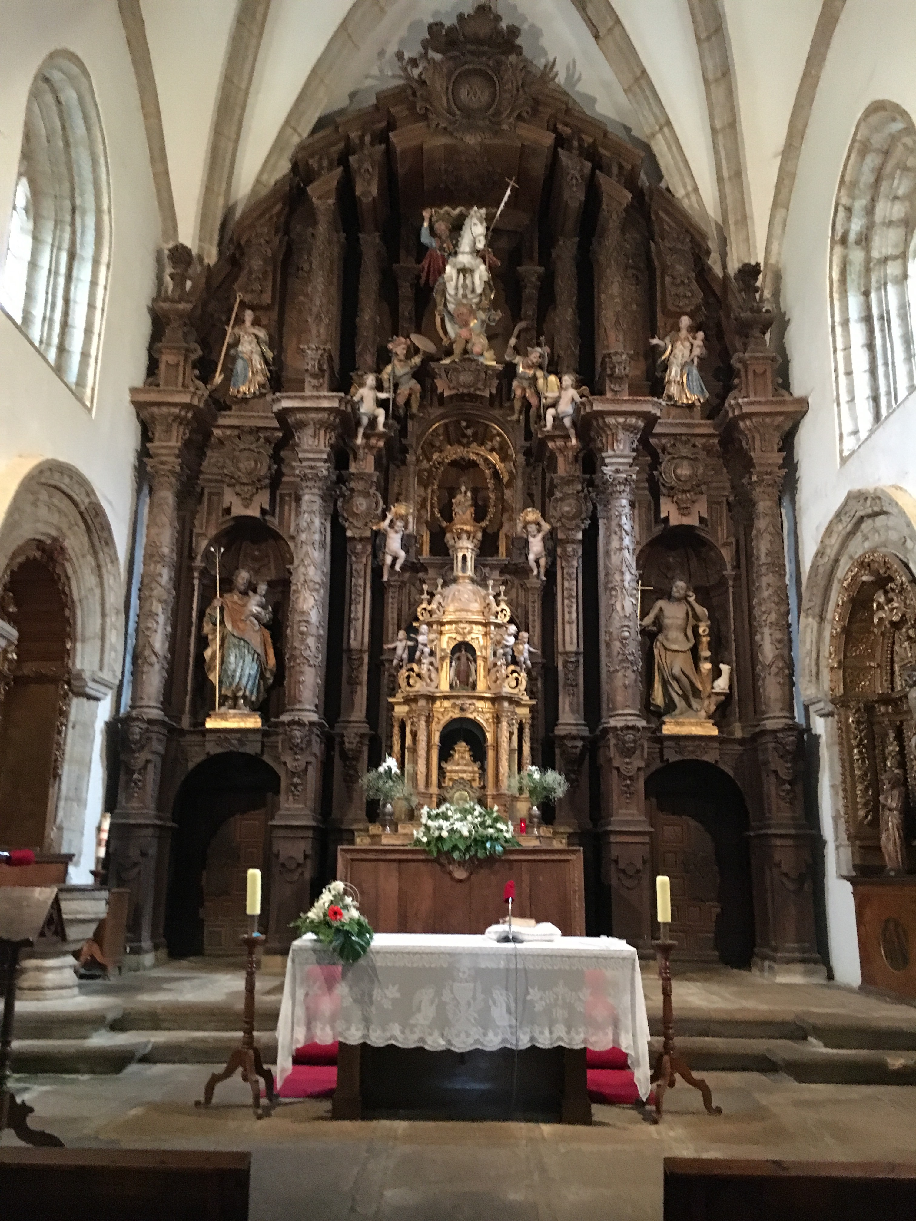 The usual suspects gathered as we headed out early this morning having our longest day yet in front of us, 30 km (19 miles) into the city of Lugo. We had our last day in the mountains and we’re now heading into lower, more rolling hill terrain. Longer mileage but easier terrain than we’ve had. It was overcast and foggy early on making it delightful conditions for walking in the cool morning air. It was such a difference in conditions that I remarked “This is so nice I could do this all day”. To which Tony responded “Good, as you’ll have to!” Spot on as usual. We carried on until we were surprised to find a small food truck next to a church selling coffee. Considering that we knew this long stretch wouldn’t have cafes or bars it was a welcome diversion. A woman came out of the church and offered to stamp our credentials (which all pilgrims carry to prove they’ve hiked) then suggested we look into the church. We haven’t done that except in some of the small ones right on the way, but this was a very ornate one, compared with the little ones.
