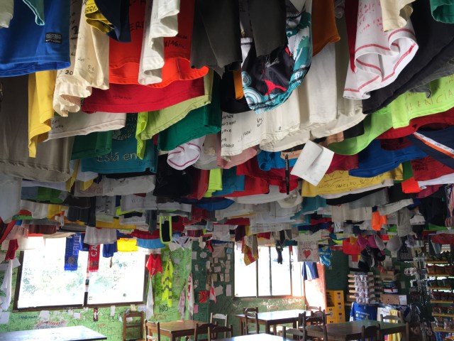 We paused any number of times to recharge with coffee or drinks or just to take off our shoes a few minutes. We did find one of the more unique bars along the way with old t-shirt shirts hanging from the ceiling. It wasn’t the nicest stretch by any means, particularly since we had gotten used to the relatively few number of pilgrims on the Primitivo. Now that the route merged with the Frances route there are many more hikers, many of which are just hiking the last 100k. Many have services carry their bags so they hop along like free little birds. Somehow it seems like cheating. Plus, previously the route was so clean, and now we’re finding litter and most of the way markers vandalized and defaced. Makes me sad to see the route disrespected.