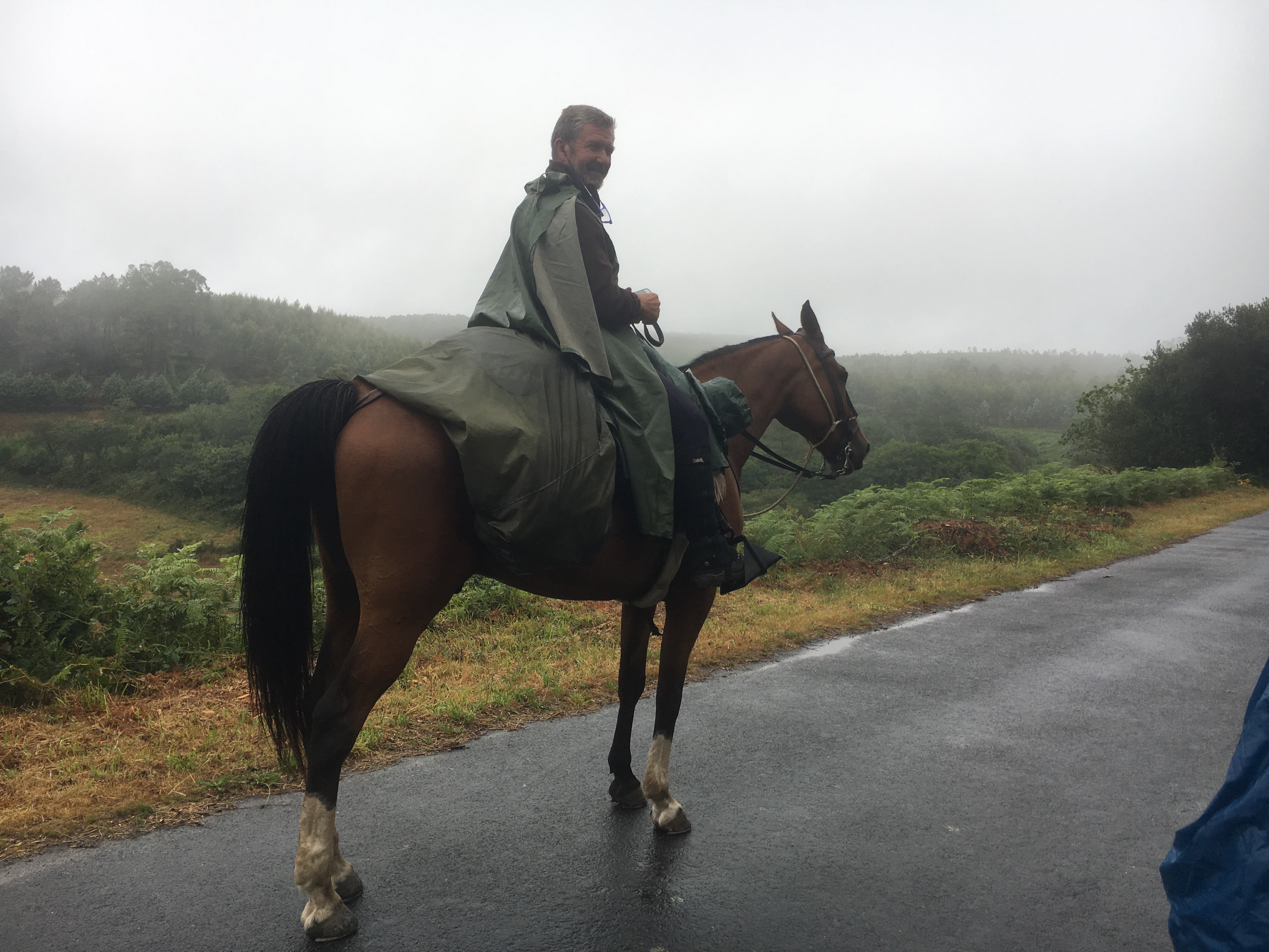 After we were about halfway there the rain abated, making happier hikers out of all of us. But the thing that gave us the biggest smile was something that came up unexpectedly behind us – a man on a horse! And it was a beautiful horse and a handsome man! He said the horse’s name was Peregrino, Pilgrim. How appropriate. We followed the horse’s hoof prints most of the way into Muxía. We headed to the albergue that our fellow hiker, Leo, recommended, as he’s been staying there. It’s a grand place – we have a private space and bath for the four of us. We’re in heaven! And, as we were checking in, who should appear but the man on the horse! We had Mandy ask him where in the world he put his horse and found it tied up right outside to a statute.