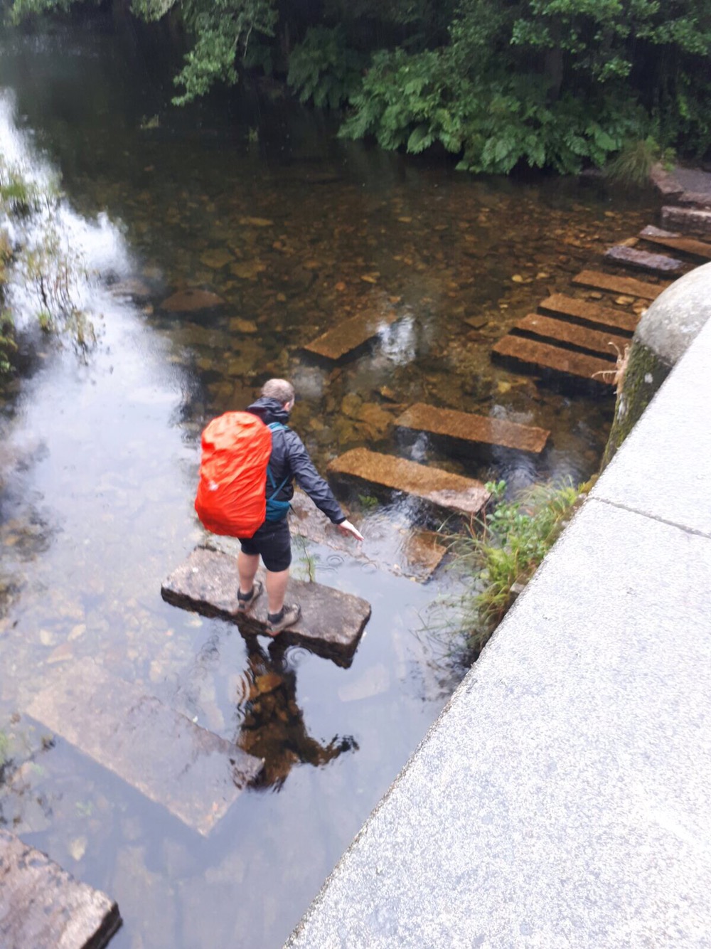 The rain wasn’t too bad, starting out as a soft rain, getting a bit harder as we went. At one point I had to laugh as I looked up ahead and saw Tony lift Mandy lock, stock and barrel over a huge puddle that covered the entire road, so her sandaled feet wouldn’t get wet. And wasn’t that thoughtful after he tried to walk across a river on the old stone blocks, getting his own boots wet, that had to be used prior to the local community building a bridge over it.