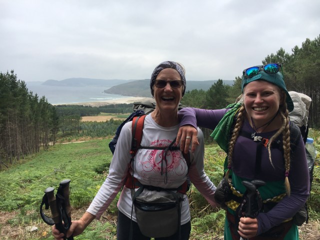 We had a bit of a “lie in” sleeping till almost 8 before stirring. Luckily the meditation “ohm-ing” didn’t begin until 9 just as we were leaving. Can’t say I was sorry to see the end of that spot. After wandering around town a bit looking for an ATM, we stopped for coffee, running into Connor, then figured out the path North to Lires along the coast. We intend to hike a triangular route from Santiago to Finisterre to Muxía and back to Santiago. At times the markings aren’t quite as clear as before, when everyone was basically hiking the same direction to Santiago, no matter which Camino they were on. Now pilgrims have a number of options so you frequently pass people going the opposite way. Seems a bit jarring at first. Plus the markers go both ways with no km noted.