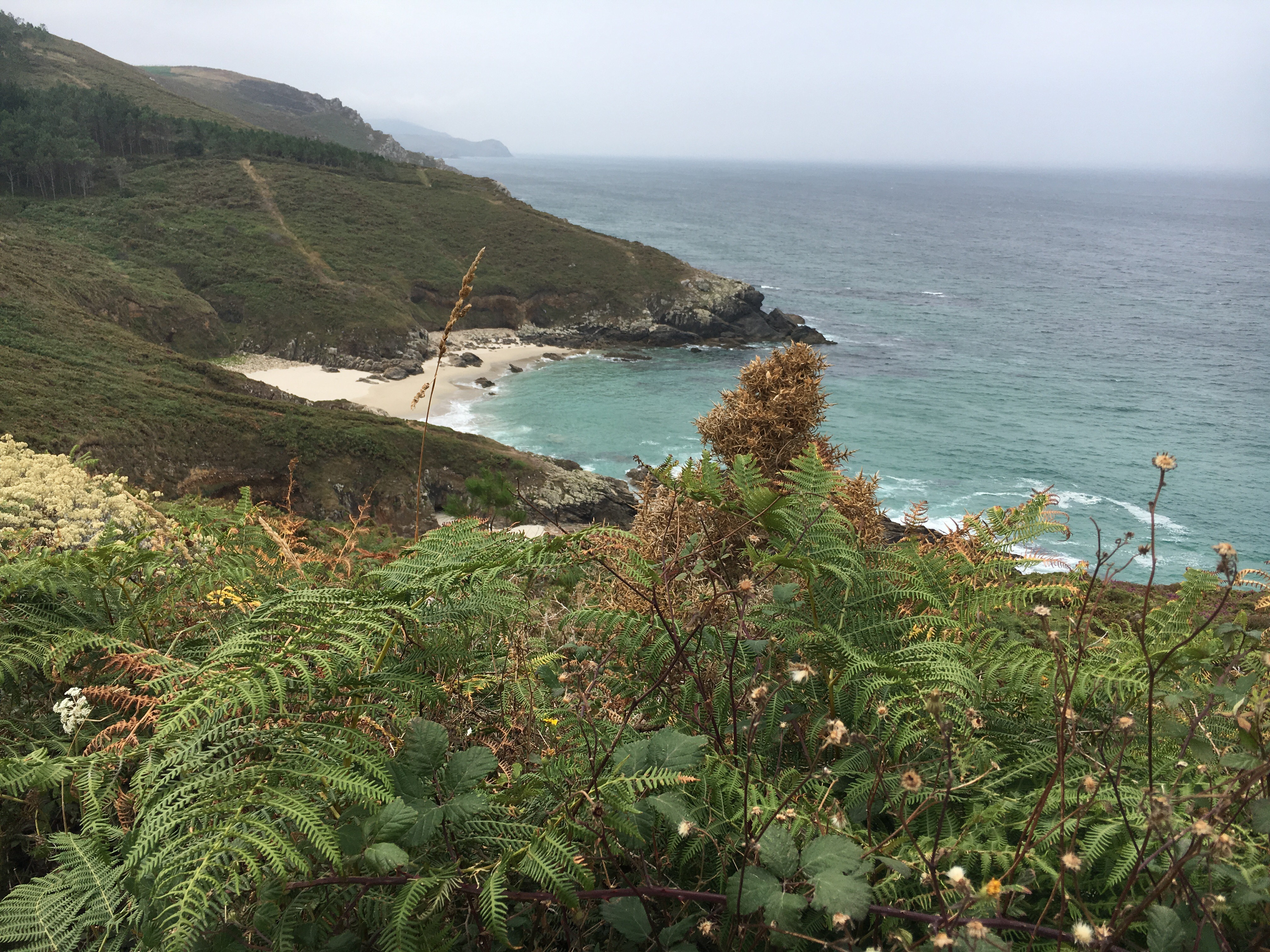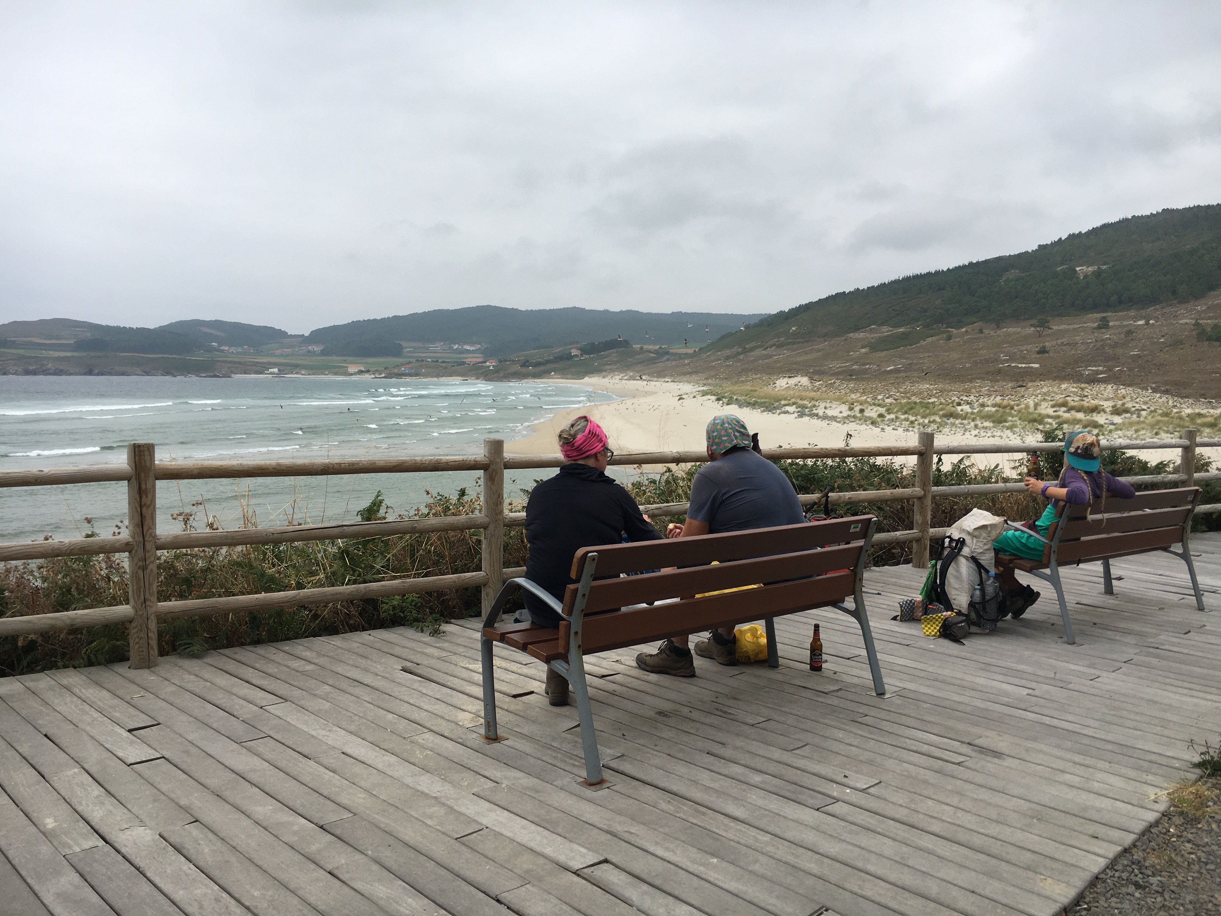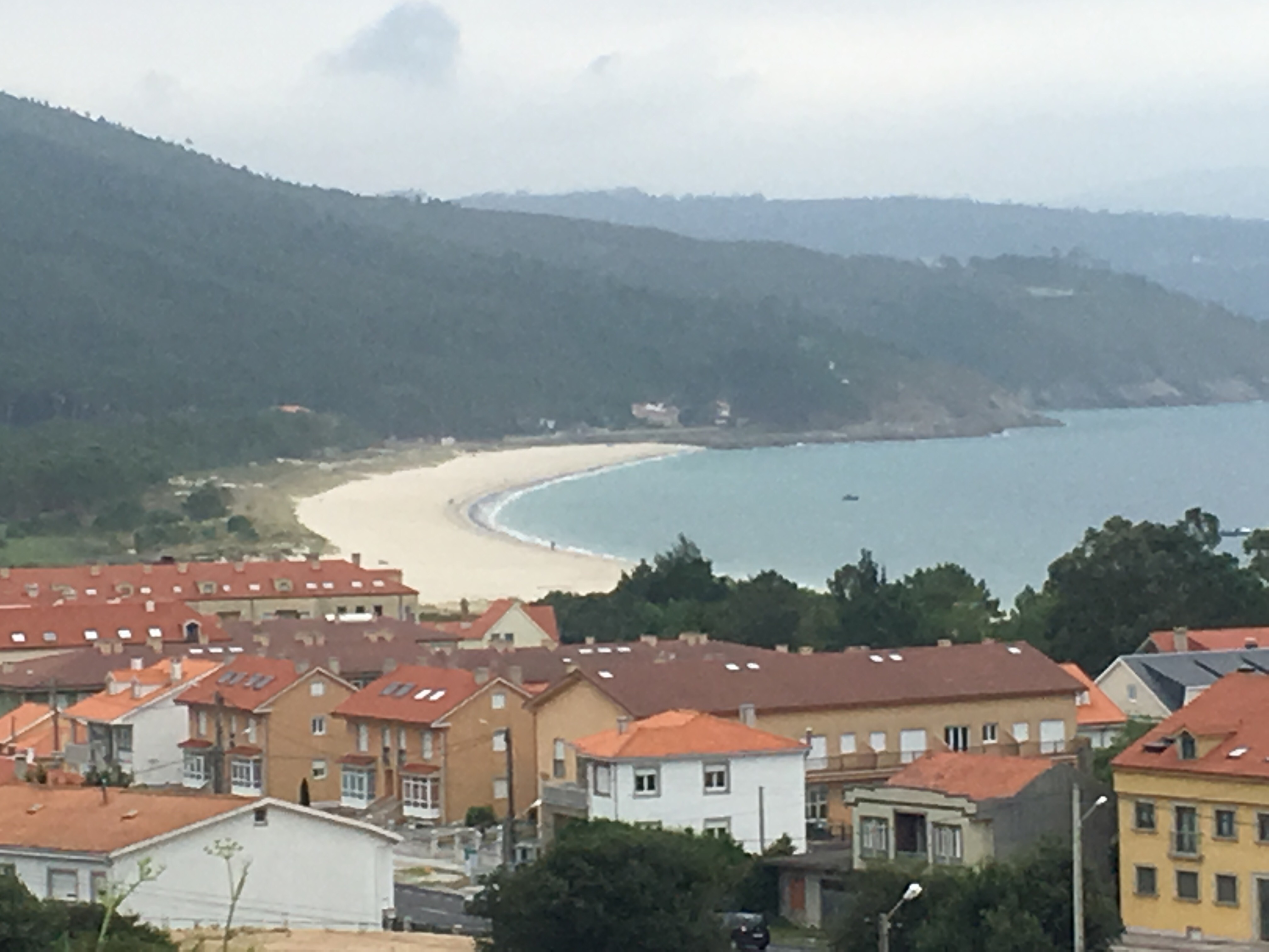 We had a bit of a “lie in” sleeping till almost 8 before stirring. Luckily the meditation “ohm-ing” didn’t begin until 9 just as we were leaving. Can’t say I was sorry to see the end of that spot. After wandering around town a bit looking for an ATM, we stopped for coffee, running into Connor, then figured out the path North to Lires along the coast. We intend to hike a triangular route from Santiago to Finisterre to Muxía and back to Santiago. At times the markings aren’t quite as clear as before, when everyone was basically hiking the same direction to Santiago, no matter which Camino they were on. Now pilgrims have a number of options so you frequently pass people going the opposite way. Seems a bit jarring at first. Plus the markers go both ways with no km noted.