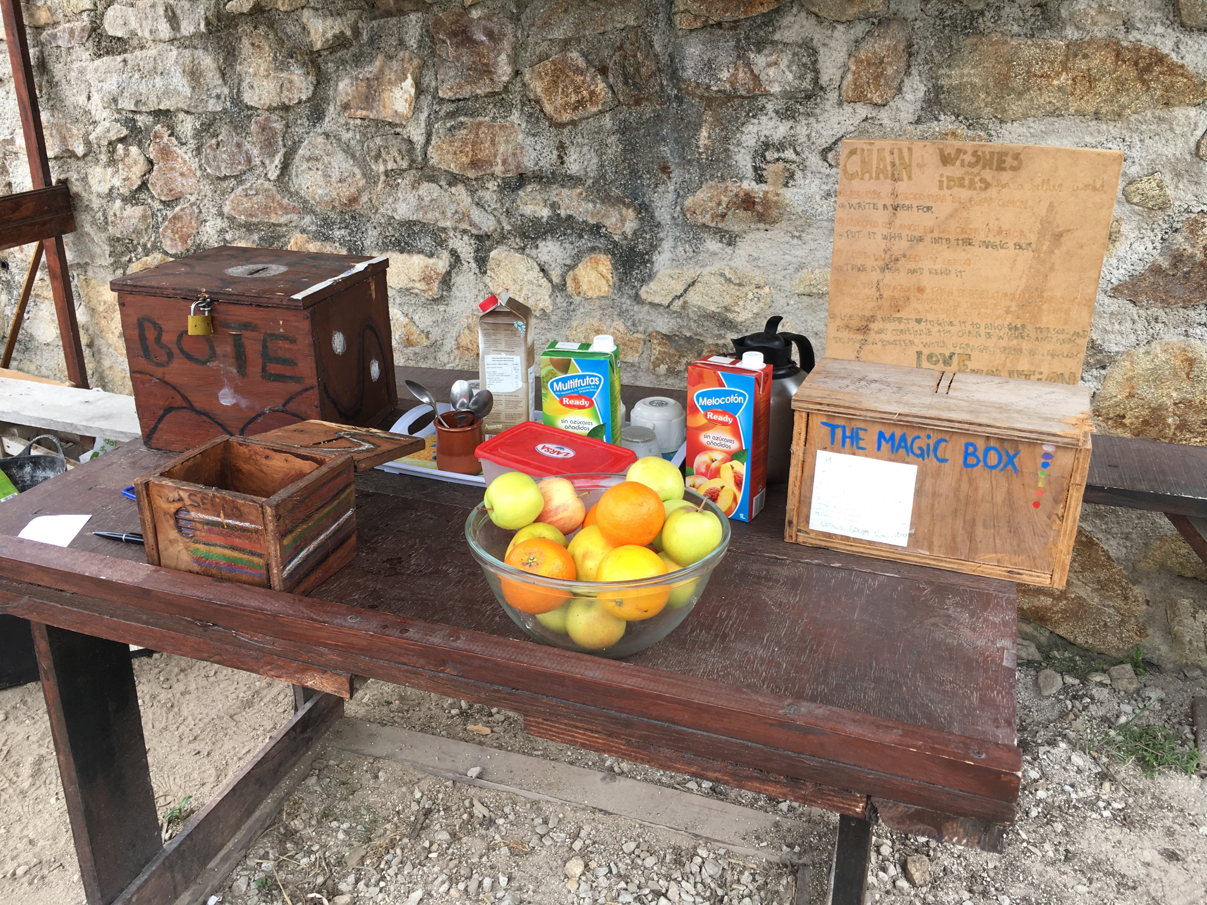 We were purposefully taking a short hiking day so easily took any alternative path offered if we thought it looked good. On one of those we came across the magic box. It was an unexpected stop along the path that wasn’t in the guide book but totally charmed us. There was a table with a box labeled “the magic box”. We met two women who had got there just before us – German and Irish. They read the box details to us…. We were to write a note with a wish on it and put it in the box, then were to take out wish and carry it with us, praying to make it so. What a nice concept. We all did as expected then carried on.