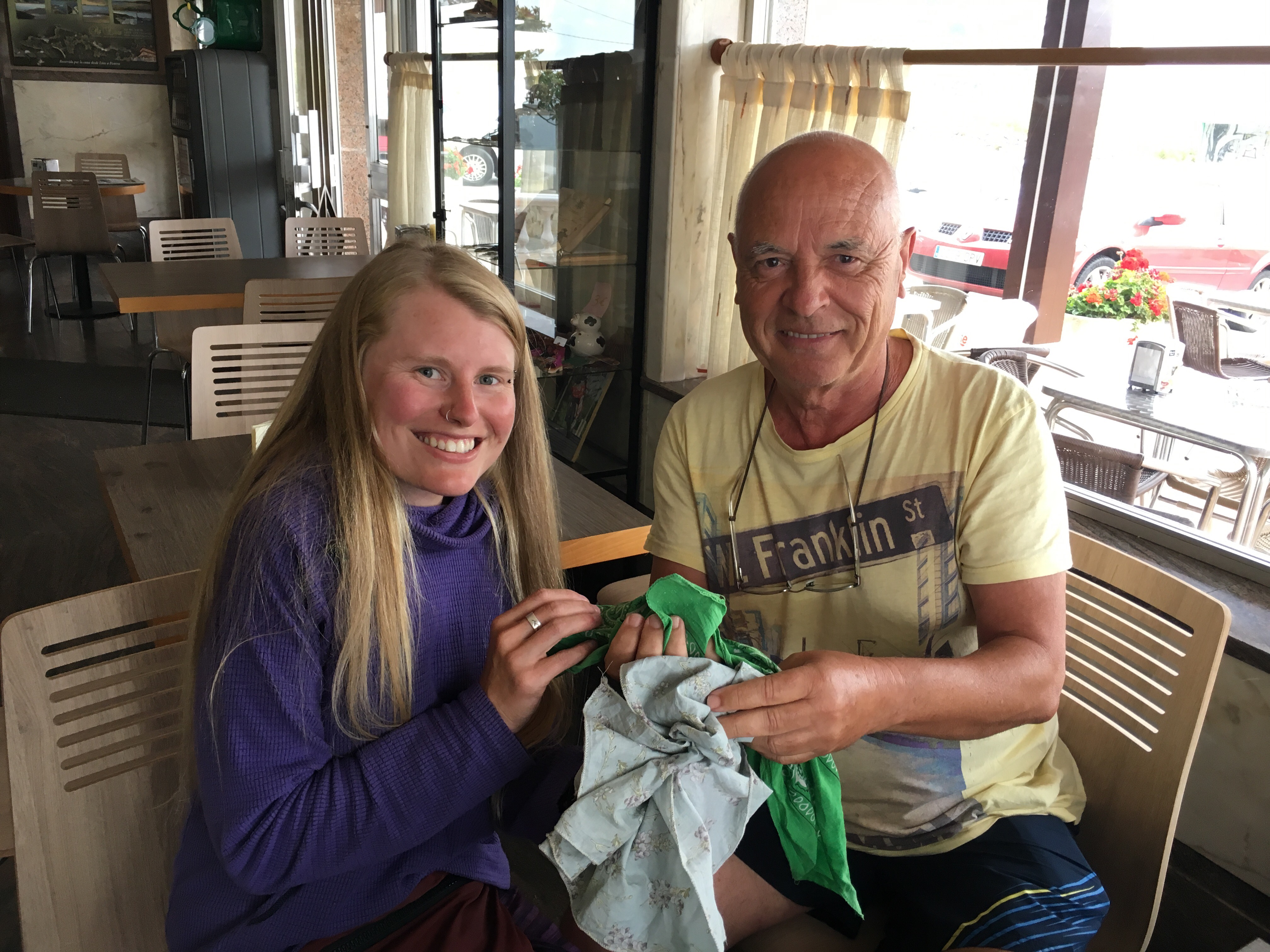 As we were checking in we saw the 3 Spanish gentlemen we met a few towns back that Mandy had chatted a bit with. After she admired the bandana one had he said he’d give it to her. She suggested they swap, so that’s exactly what they did.
