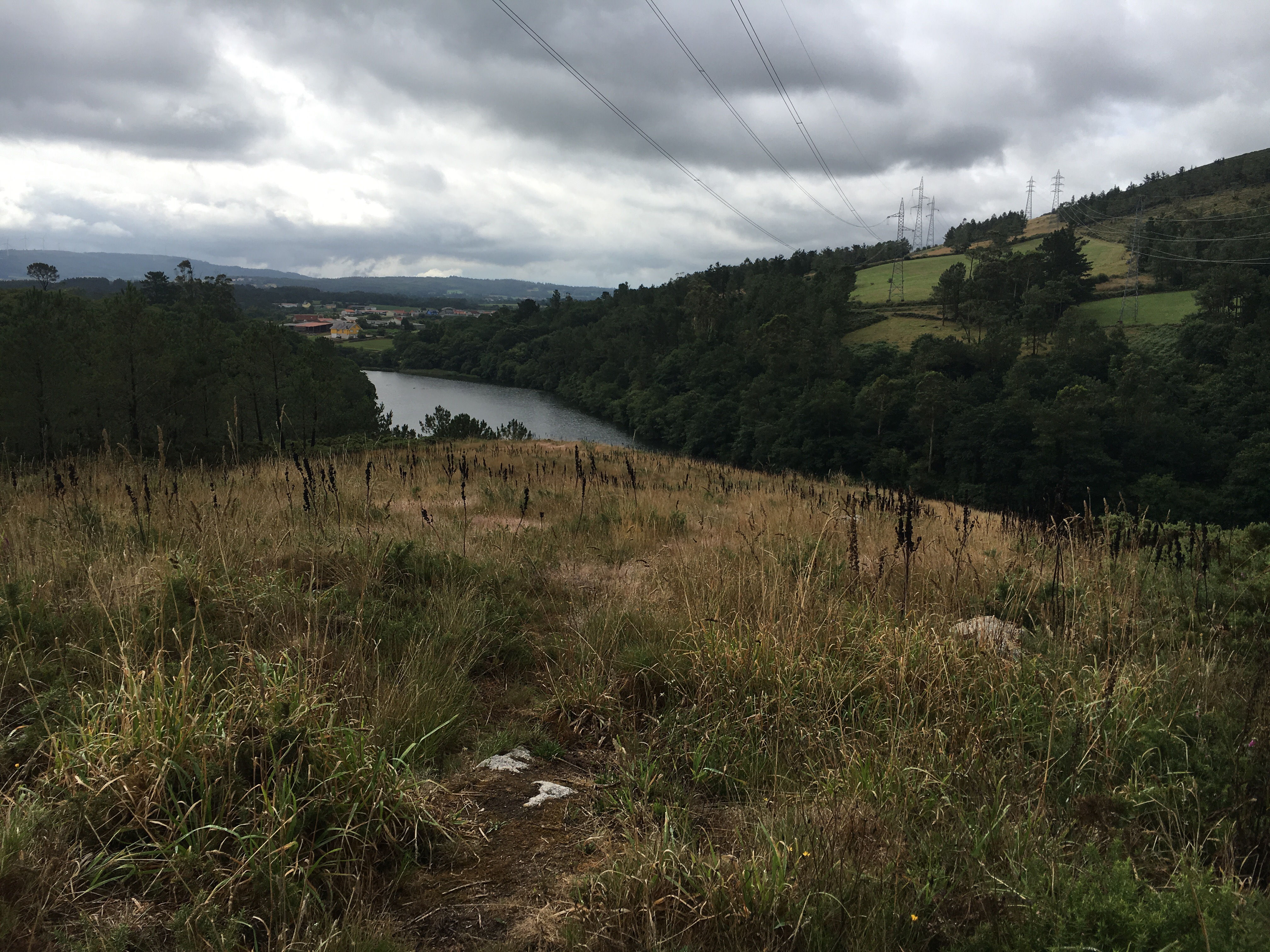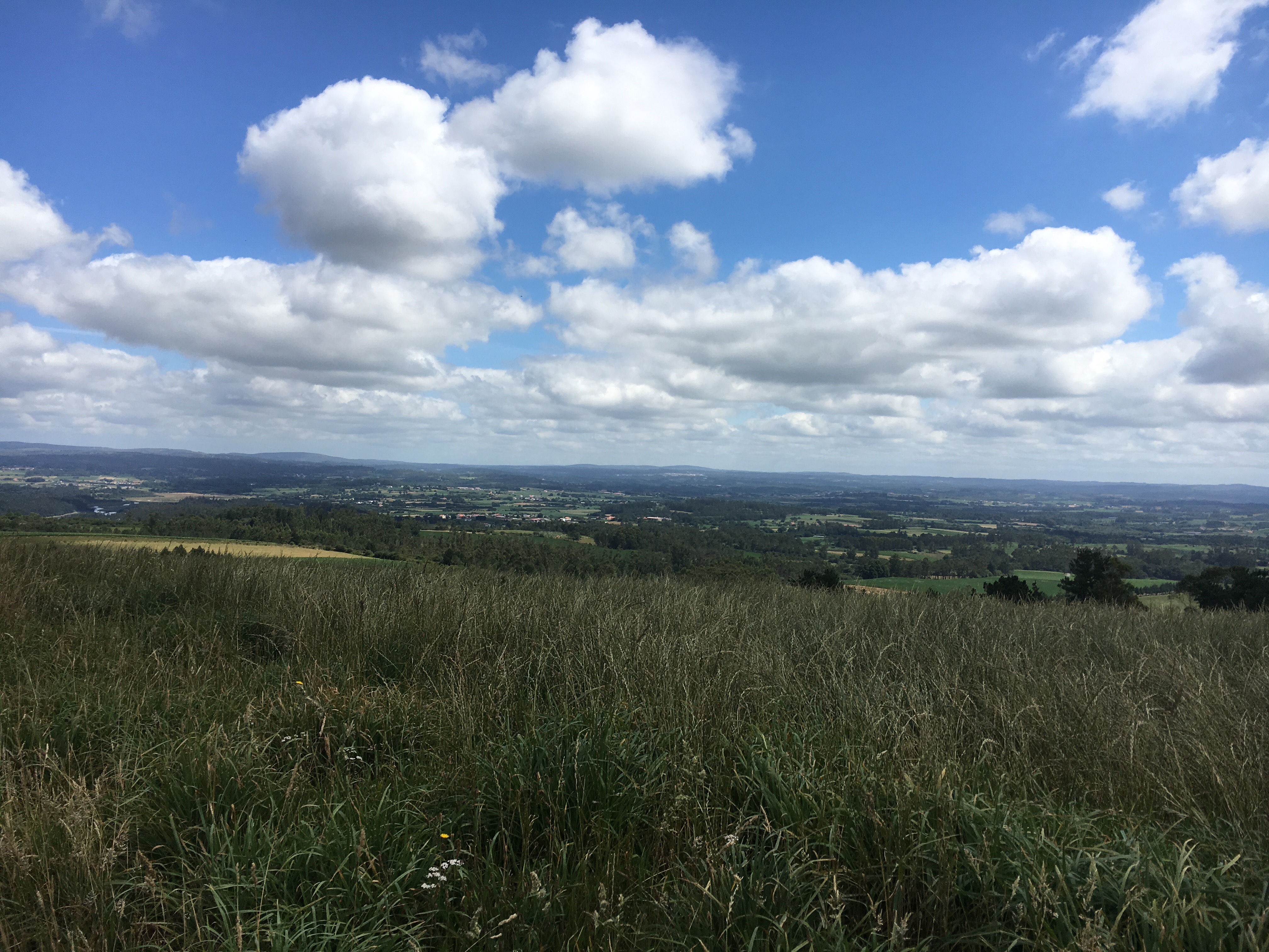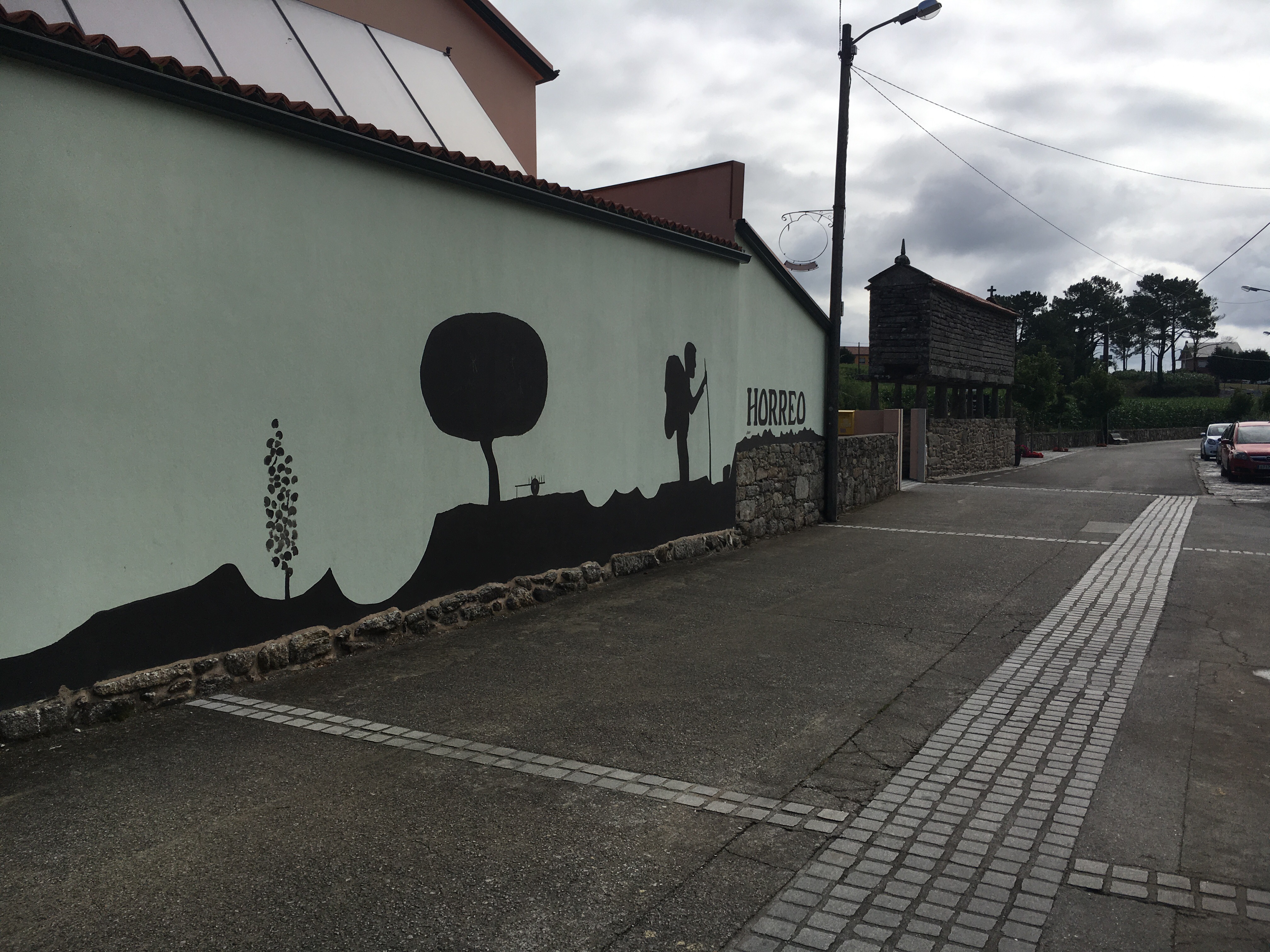 After a dreadful night with one of the worst snorers imaginable, we got up to find that fortunately the forecasted rain came during the night. We ate a quick breakfast breakfast from out packed food, said a goodbye to Sarah as she headed off to Muxía and who knows where from there. We started out on another soft morning of mist hanging over the hills, with cool walking weather. We rocked along. We reached the round about where the split between the routes to Finisterre and Muxía meet. At that point we were retracing our steps out. But it’s amazing how different things look going the opposite way. We stopped for coffee at Hospital, where the owners remembered us, which was sweet. Eventually we stopped for lunch at one of the bars we had before and who did we run into, but Mariana, the French woman, who had been hiking with Leo. Small Camino world. We later stopped to chat with three Spanish cyclists. They were asking about places ahead and wanted to know why we were headed backwards. We mentioned that we would be back in Santiago on Saint James’s feast day…. Not exactly what we wanted, but it’s how things are timing out. They mentioned that both the King and President of Spain will be there. Oh, my. Sounds hectic. They weren’t fans of either.
