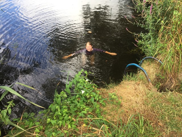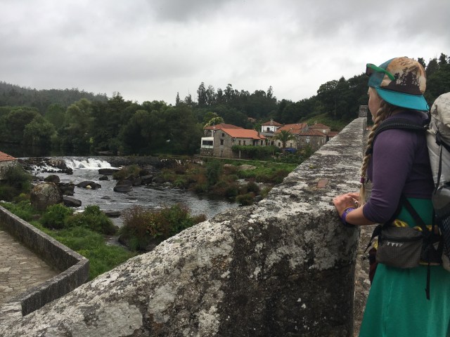It wasn’t long before we were back in the town of Ponte Maceira, where we had such a fun afternoon on the way to the coast, swimming, jumping off the rope swing and soaking feet. But this time around the weather wasn’t cooperating. It had rained overnight, and was still mostly overcast, though not cold. Did not appear to be swimming weather, much to Mandy’s dismay. She had so been looking forward to another go at the rope swing. With her head hung low, we decided to continue on, but I knew how disappointed she was. We walked a ways and then, oh, my, there came a sun break. More like a sucker hole. She turned around and said “do you mind if we go back?” Well, of course not! So back we went. She got out of some of her clothes, gave me directions on how to catch the rope once she got in the river to throw it, and where best to take pictures. In she climbed declaring “brrr, it’s cold”. But out she went, grabbing the rope and tossing it my way. Only took a few tried before I caught it. She gamely jumped in three times. I happily passed up the opportunity.