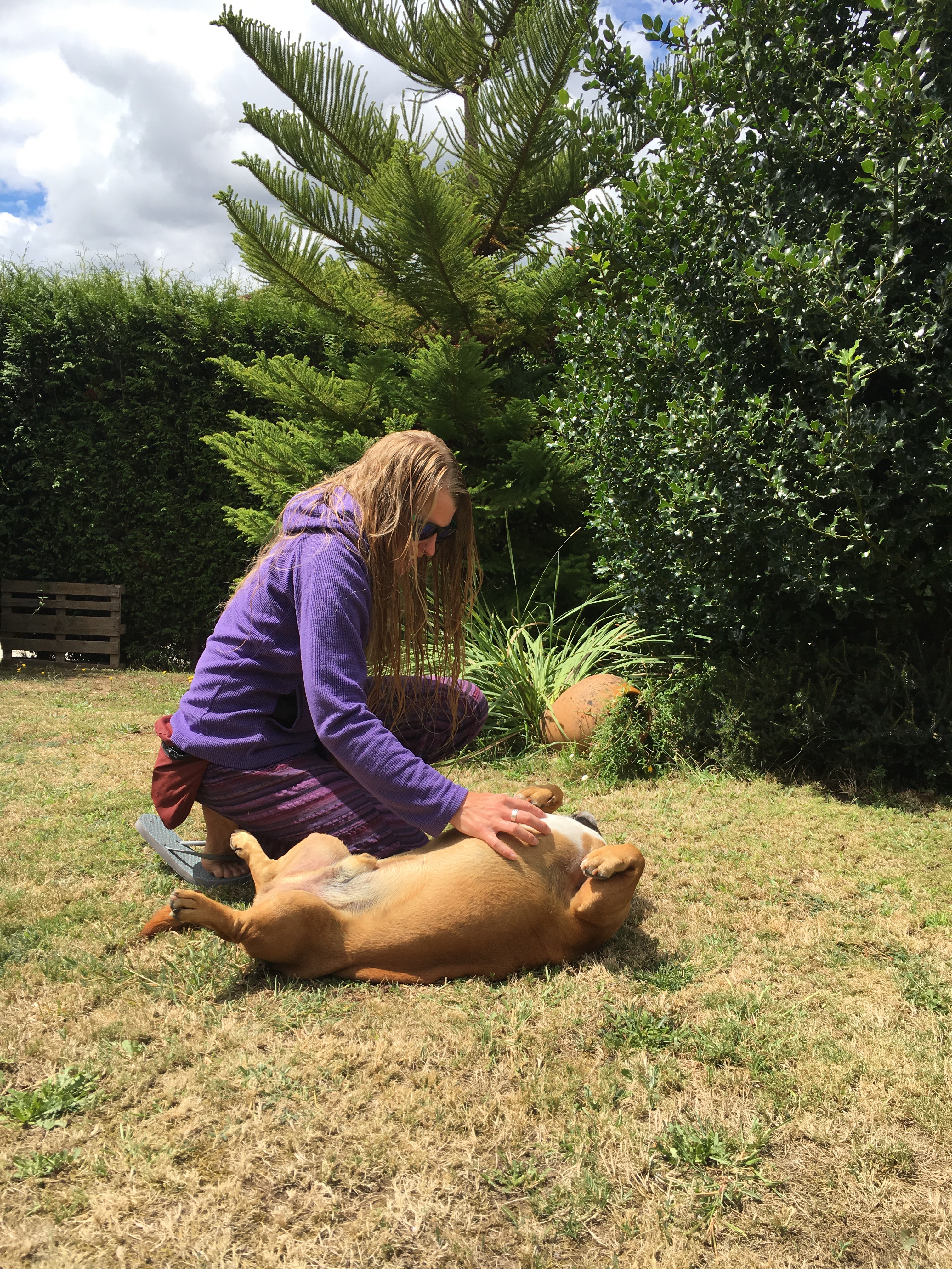 Dried and dressed with wet things hanging off packs, we walked on. Up to the top of the hill where we first heard about the lure of the river, back down what had been a long slog up, we stopped at a tiny bar for lunch then walked to a small albergue to stay just 10-12 km outside Santiago. It’s in a residential house, run by a sweet Spanish woman, named Rosa. A nice spot for our final stay on the Camino itself. We were first greeted by the owners dog, Bruno, barking up a storm, but has now become Mandy’s new best friend, enjoying lots of back and tummy scratches. Their cat, Beni, was determined to get in on the attention. A good animal fix for Mandy.