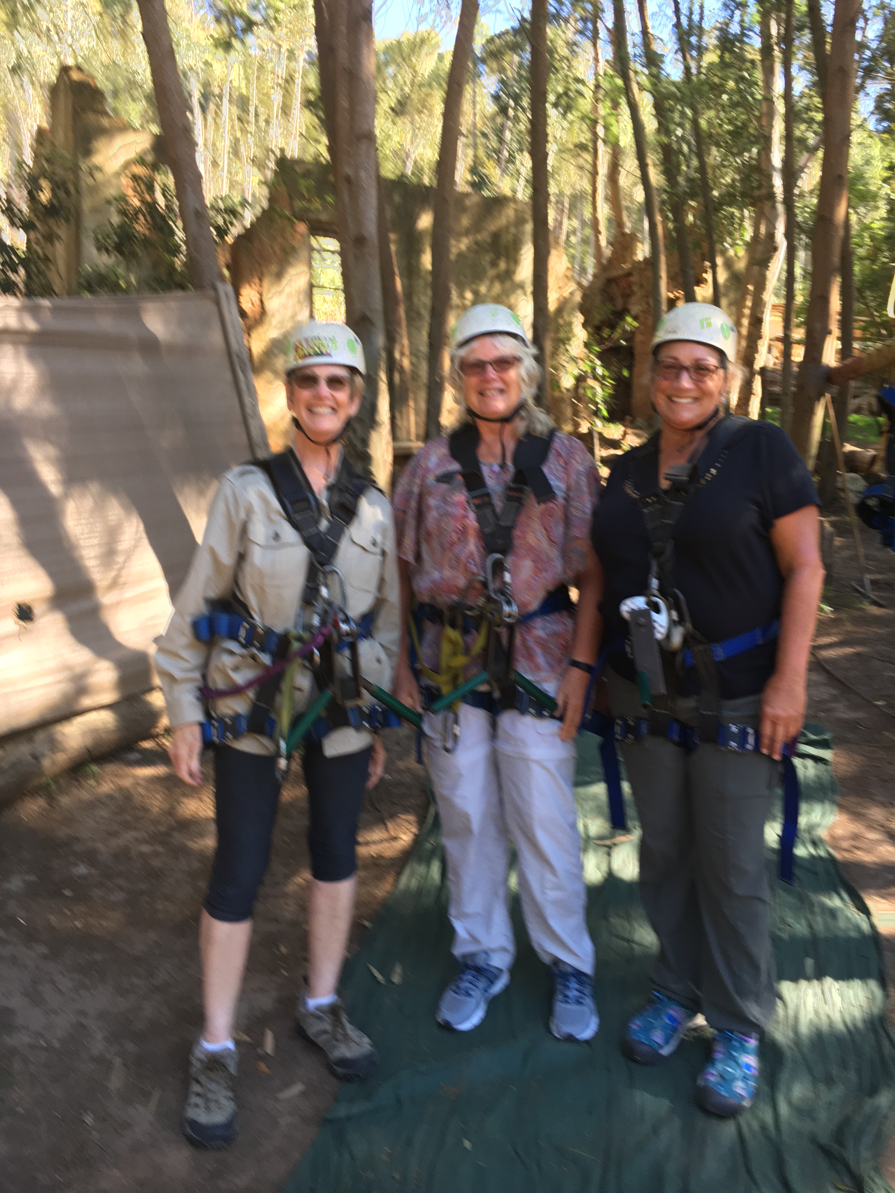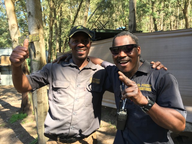 We headed for the town of Hermanus and just outside of it we came to the SA Adventures. We came to zip line! They started us out by cladding us in harnesses and safety helmets and showing us how the gear operates on a small section of line. Once two other pairs of fellow adventurers were outfitted and trained we all climbed into a rustic trailer with benches along the side pulled by a tractor. They drove us up the hillside over very rough paths then had us disembark and hike up the rest of the way. At that point I was ever so glad I’d done so much hiking of late, though it was rather awkward with the weight of the line equipment dangling off my chest. We finally reached the top line, the first of ten we rode down the hillside. We had a guide zip down first and the second one stayed with us to hook us each up in turn. It was amusing to hear them whistle to each other to give the alerts for when they were ready – it sounded just like the local birds. One by one we took off getting the feel of the gear and the speed. It seemed counter intuitive to not hold on tight and pull down on the handle, which instead was what braked it. In any case, with each successive line we all became more confident. Except the two twenty-somethings from Dubai. My first clue was that one of then had her phone out and was recording the hike up but somehow couldn’t manage both things at once so one of the guides had to hold her hand up. Hmmmm… Then she asked at each successive line “How do I brake?” By the fifth line the English guy with us turned to me and said “10 Rand says she’ll ask how to brake”. Ha! I told him he had too much of a sure bet. Ah, to be that self-centered age. No way. But I was especially proud of Dana who is afraid of heights yet she did the entire thing with us with no fuss. We zipped through a forest of mostly eucalyptus trees, and just as in Spain, they were brought into the country and have taken root. Thanks to our charming guides, led by Nkosa, who was equal parts expert and comedian, we all survived and enjoyed it immensely.