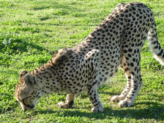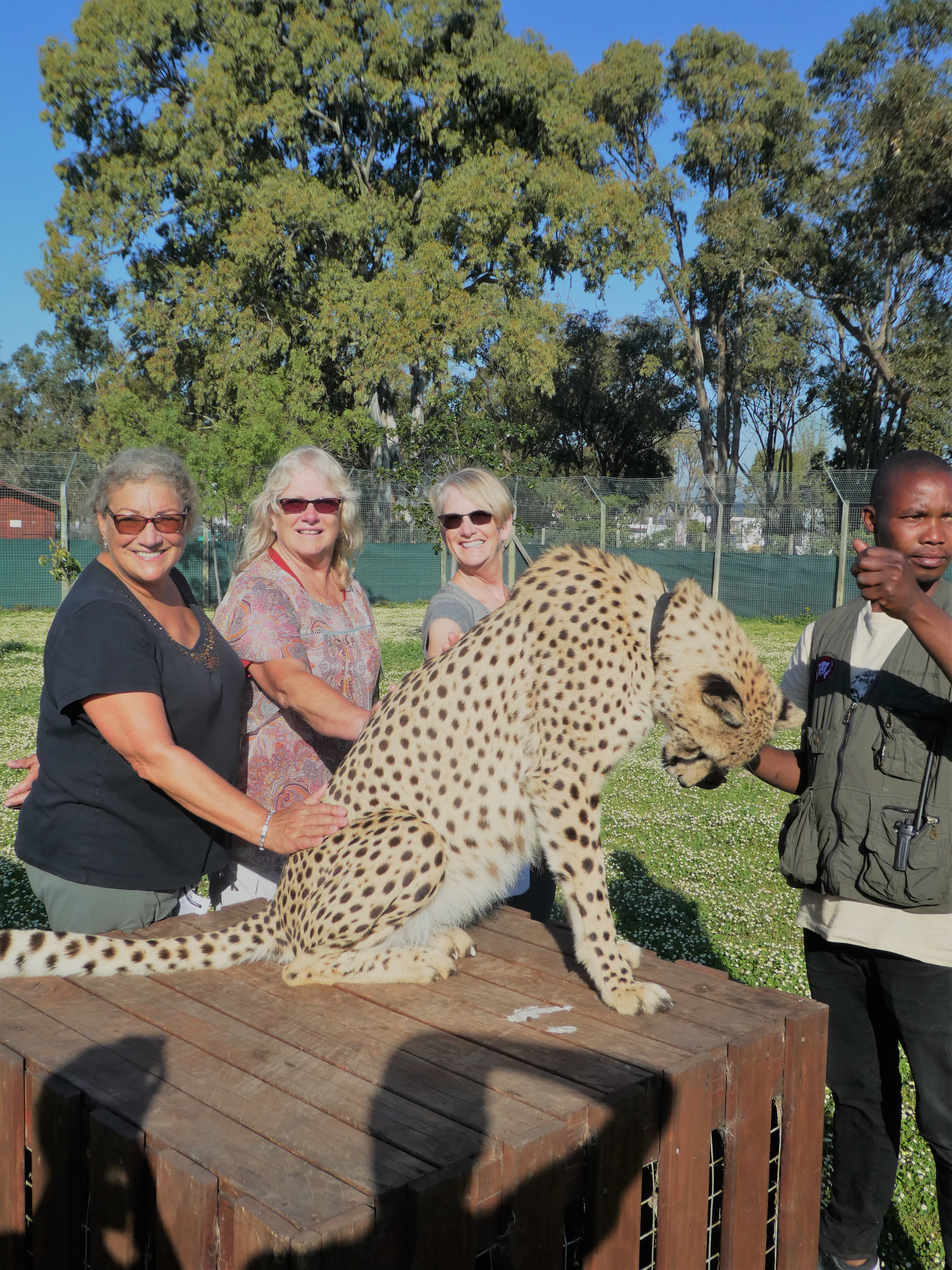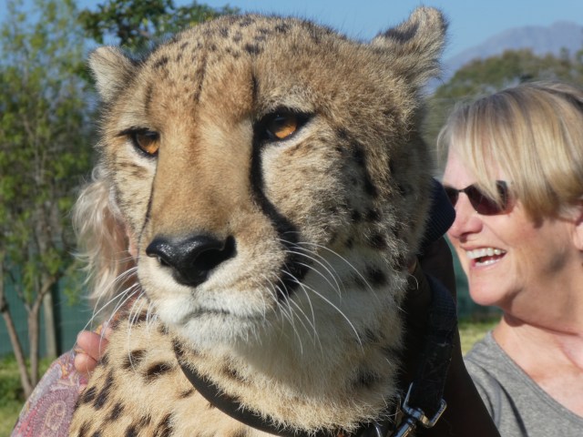 The lunch though took longer than we expected so we had to scurry back toward town to be able to see the Cheetah Outreach, which was planned for the afternoon. This is a place that houses a number of cheetahs and a few other type of animals that are endangered in an attempt to increase awareness and funding to preserve those in the wild. We got there just 40 minutes before closing, but still got to do the up close and personal with the cheetahs. They first have you put all your belongings in a locker and hand over your phone or cameras to the volunteers, so not to have anything drop and scare the animals. Then we had to sanitize our hands and dip the soles of our shoes in a bath so we didn’t introduce anything untoward to the animals. Then we dutifully followed the volunteer into a large pen area with a cheetah named Ebony. We were allowed to pet him together and singularly, while the handler kept hold of the animal. It was amazing to be that close, to hear him actually purr and to feel the coat! They are beautiful creatures and while I hate to see them penned in captivity, that’s how they were raised so they wouldn’t able to fend for themselves in the wild. If it makes more people aware of their predicament then hopefully good will come of it.