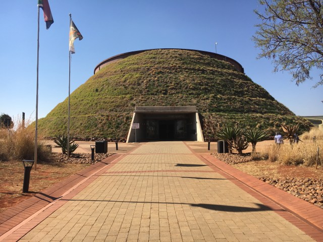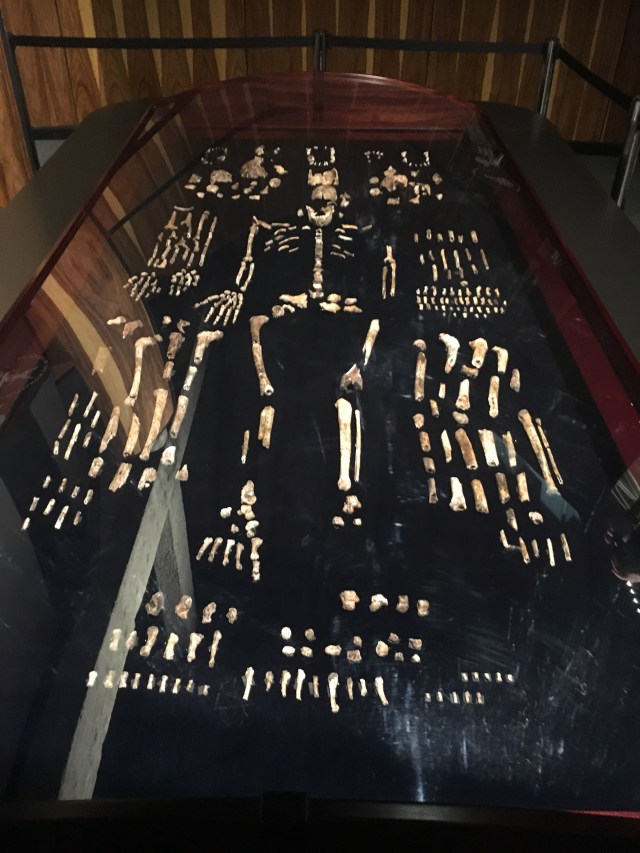 We were up early this morning, all packed and ready for our ride to the airport. We snagged a to-go coffee and some bread and cheese from our sweet hotel restaurant staff and climbed into the van for what turned out to be a quick drive to the airport. Our flight (flight #4) to Johannesburg went without a hitch, only a few minutes late. After collecting our bags we were happy to find a gentleman holding a sign with our names on it. He had us follow along until the assigned driver pulled up. Boy, what a difference it made flying north! After cool spring weather we were hit with heat. Had to slather on the sun screen. After a lengthy drive we arrived at our destination, Maritime Bushveld Estates and were met by the gracious hosts, Brenda and Conrad. They have an extraordinary place that looks and feels like you’re in the bush when it’s just on the northwestern border of the city. The first thing we saw were the Springbok wandering by. First time I wss happy to see a type of deer. They brought us to our rooms which were actually stand alone units called rondawels – the Afrikans name for a round building. They are beyond charming, complete with thatched roofs. I loved it! We were soon met by Amos, out guide for the afternoon. A most interesting fellow – a retired history teacher who decided to guide. We headed off for Maropeng, the world heritage site for the cradle of humankind. It took us a good hour of driving out of the city environs to reach it but you see the surrounding Magaliesberg mountains. Closer in there are all sorts of mounds in the fields – termites. Arriving at Maropeng the first thing you see is something called a tumulus….apparently it’s a mounded burial ground. We went off in search of lunch first then found that the restaurant was closed due to a conference, but we were welcomed to eat at the hotel we found located behind then museum. Lunch completed we walked back to the museum but ended up basically going through it backwards. Ah, well. We still leaned about all the paleoanthropologic things associated with this area. Well done with interactive displays that would enrapt school aged children. It even included a “boat” ride through their elements – water, fire, earth and wind. Perhaps the most interesting part was the section on the discovery just made on 2013 in local caves of the bones of the homo naledi, another, earlier version of humankind.