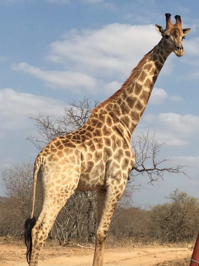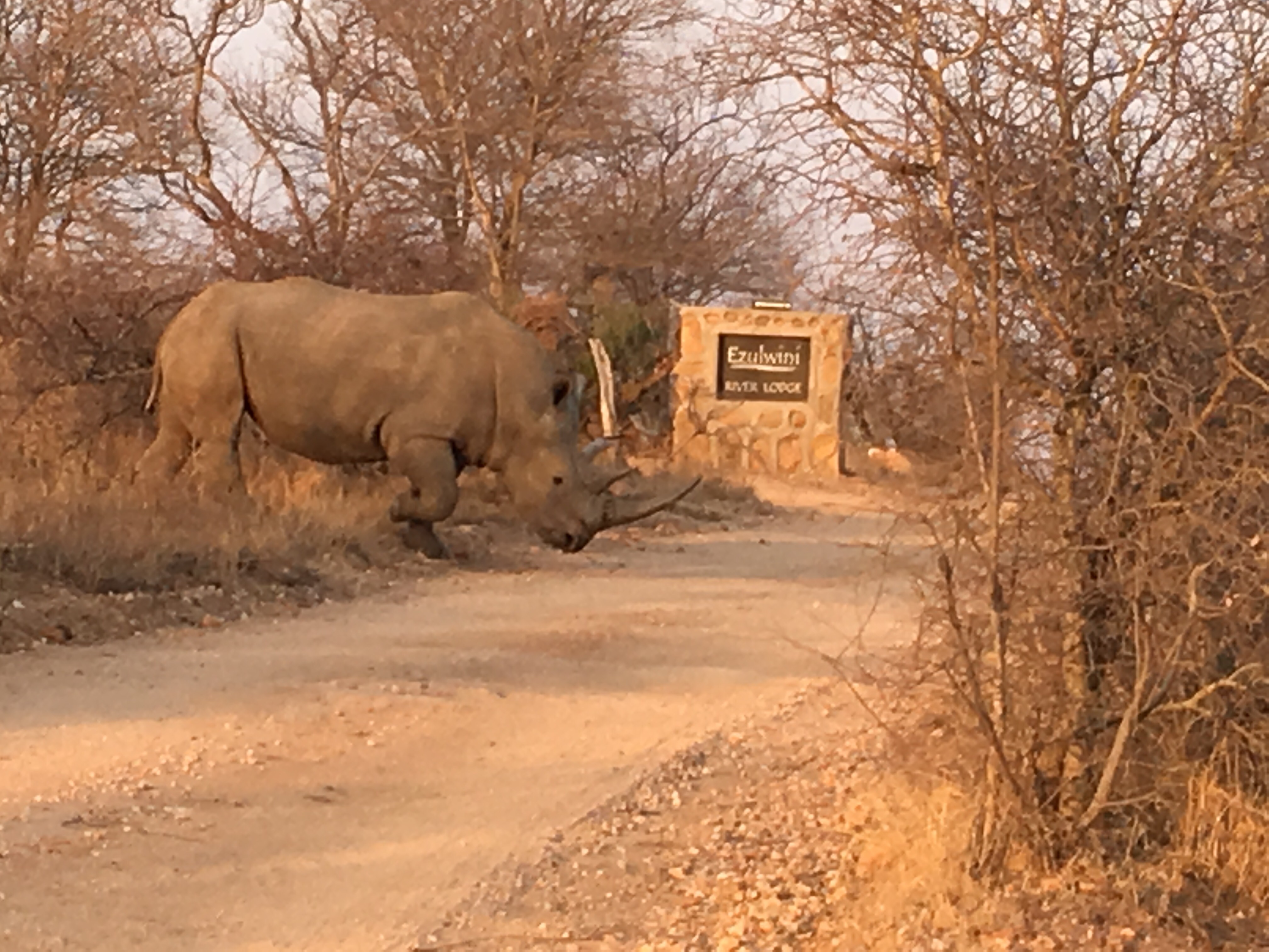 We finally pulled up and were greeted by staff that directed us to our spaces. Once again we are staying in individual rondawels, as we did in Jo-burg. Mine is labeled as the “Rhino”. You will come to see how apropos that is. We had about 20 minutes to freshen up and change our clothes before climbing into the safari vehicle with Eddie, the tracker and Tim, the driver/guide. Dar, Dana and I were also joined by Brian and Betsy, our mates from Maritime.
