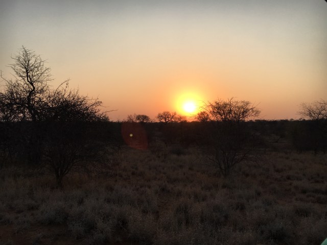At that point our crew pulled over for us to stretch our legs out of the vehicle and proceeded to set up wine and snacks. How civilized! Of course they kept their eyes out just in case, as we heard the lions roaring. It soon became time to head back to the lodge. By now it was dark so Eddie had to shine a bright light from side to side to see anything. We did spot a caracal cat, which is apparently a rare sighting. But what a great start – three of the big five all in the first day.
