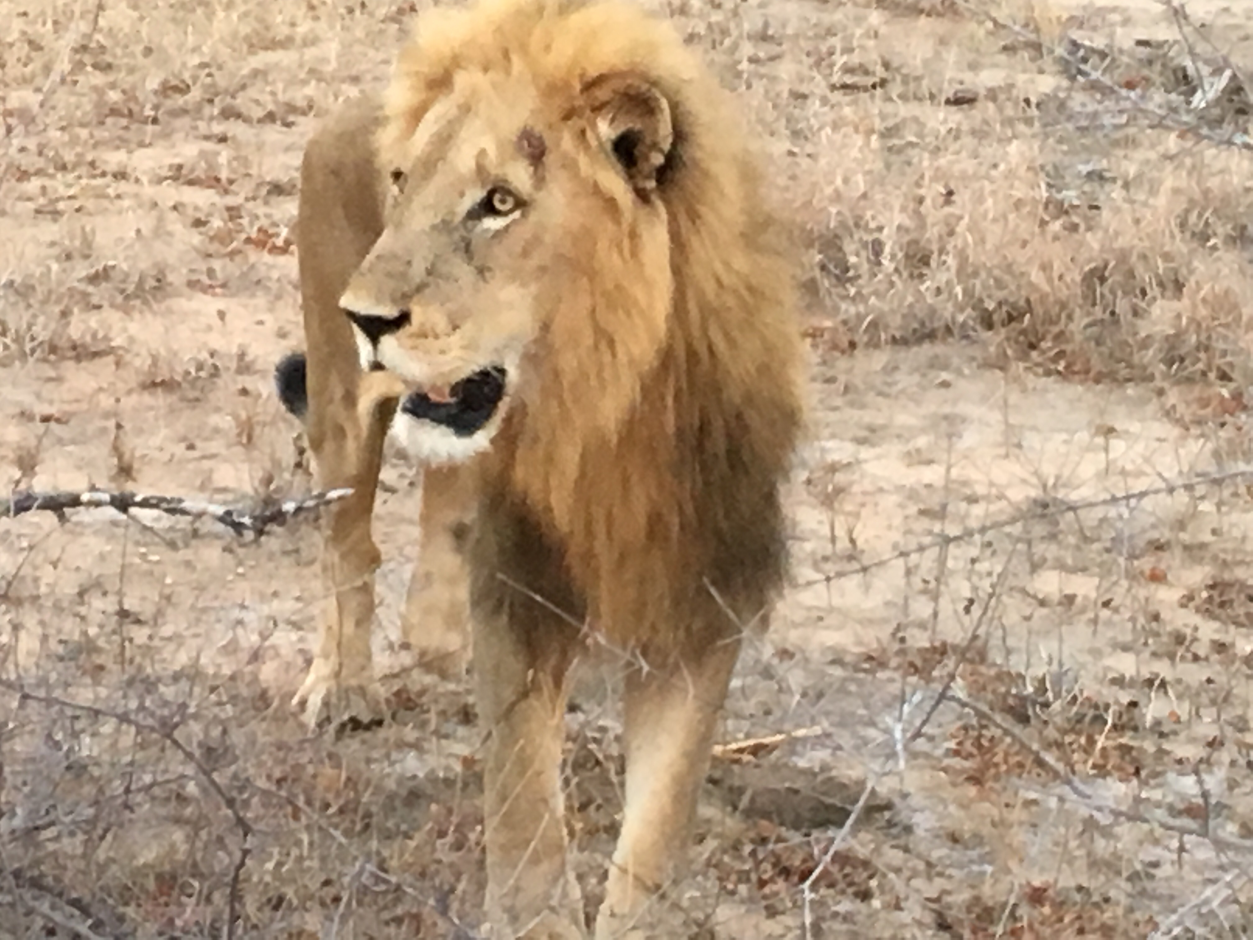 Off they drove with us bouncing along, so excited to finally be here and going out into the bush. While there are mountains in the distance it’s mostly flat with some hills. Looks just like a place that they’d leave people in an episode of Naked and Afraid. I was happy to be in the vehicle with people who knew the area and the animals. The first ones we spotted were water bucks down by the river’s edge. Then came several interesting birds, including the yellow billed hornbill, a brown snake eagle, and an African hoopoe. Next there were kudu and a grey duller, a small antelope and a slender Mongoose. But then we got some big guys. All of a sudden up ahead I spotted a white rhino! And he was huge! Just meandered across the road and on his way. We continued along until our guide heard from others that lions had been seen. He drove around in the vicinity and sure enough – here came a male lion! Pretty darn majestic. He was apparently just recently injured while killing a buffalo, so he was limping with an injured hind leg. We had stopped so we could watch him better and he strolled right up and past the vehicle right next to the rear seat where I was sitting ever so quiet. No need to call attention to myself! He proceeded to the other side then flopped down to rest. Just a bit away we spotted another male and a female. Wow! Things just kept getting better.