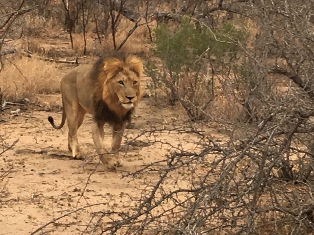 And then, rather unexpectedly, we heard roaring. Lions were calling to each other! Well! We couldn’t believe that after seeing lions each day that we’d be lucky enough to see them once again. We waited patiently along the path and were rewarded with a male lion passing right by us on his way to meet up with other lions further ahead, which we could not spot. The roaring continued for quite some time and was amazing to hear.