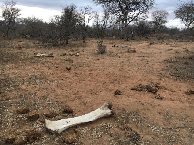 We moved along until we came to a place where there was a wildebeest skull, which Tim pointed out to us. We have yet to see one, but are still hopeful. Then he pulled over to a clearing for us to have our morning coffee and it looked like an elephant bone yard. Apparently two male elephants at one point got in a tussle and one was killed. Some of his bones, which were huge, and some of his skin remained on the ground.