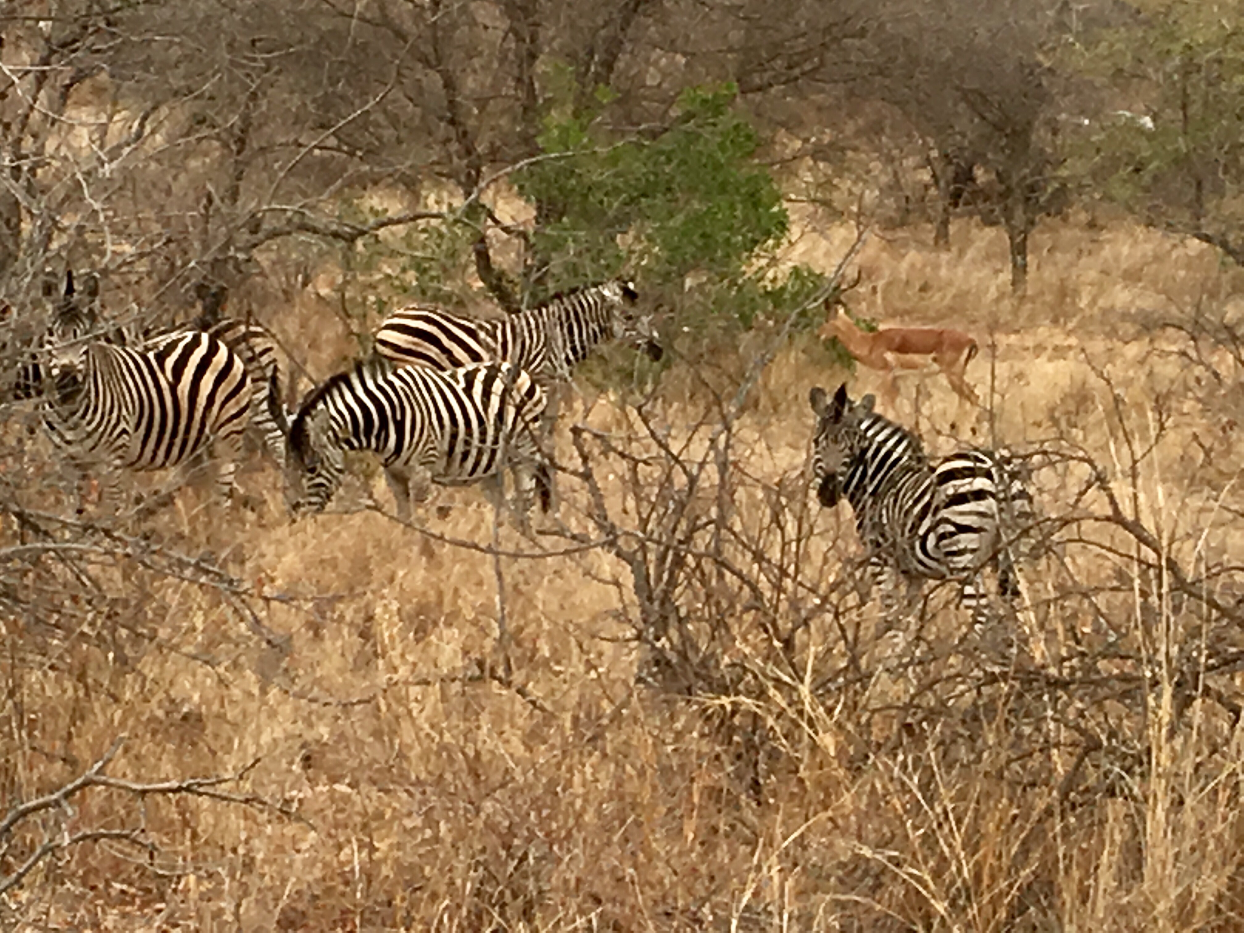 Just when we were thinking that might be about it, what did we come across? A group of zebras! And they weren’t hiding in the bush this time. Tim stated it was an unusual spot for them, but we were thrilled. They are gorgeous creatures, though they don’t look real. We took quite awhile just stopped there watching raptly.