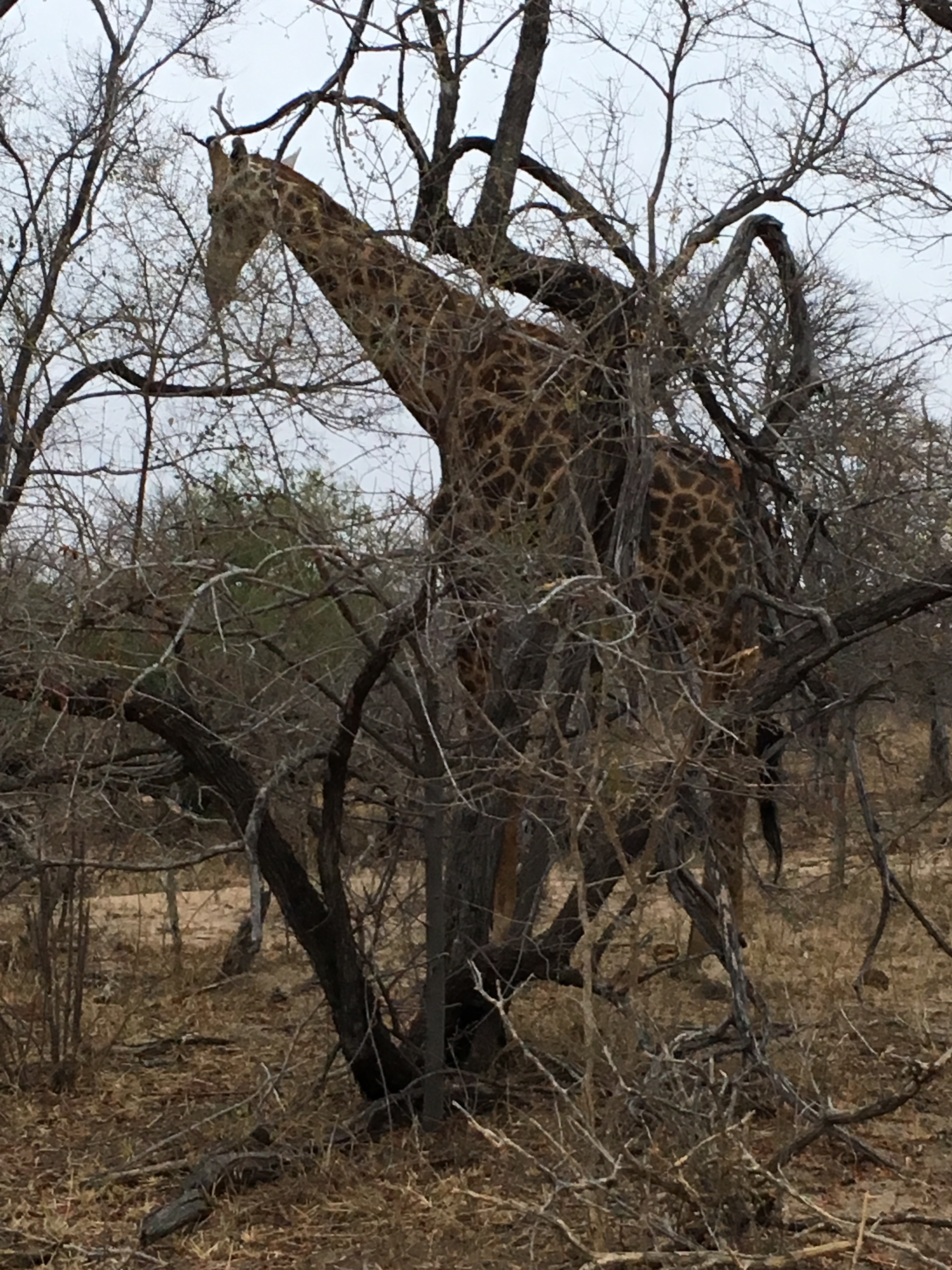 And then it was back to the lodge for our final breakfast on the patio and packing up for our ride back to the Hoedspruitt airport. We said our goodbyes to Knox and Hector, our fabulous host and tracker. As we drove out we saw giraffe after giraffe. We finally came to a paved road, which seemed to be a bit discordant for the place after being only on dirt tracks for so long. Our driver asked if we wanted to stop briefly at a local market for last minute souvenirs. Well. Of course we did. Several hundred rand later we crammed our new purchases into our back packs and climbed back into the waiting van. Not long after we arrived at the airport. It’s a small one but it was hectic with several outgoing flights at the same time. We boarded our flight then had to wait an extra 20 minutes to be cleared for takeoff. The flight, our 6th on this journey, was quick and uneventful. Back at the Johannesburg airport our challenge was to find the hotel shuttle. We’ve gotten a bit spoiled having a driver meet us everywhere. Eventually we found it waiting and ready to take us the few minutes to the hotel for our overnight stay prior to flying up to Zimbabwe.