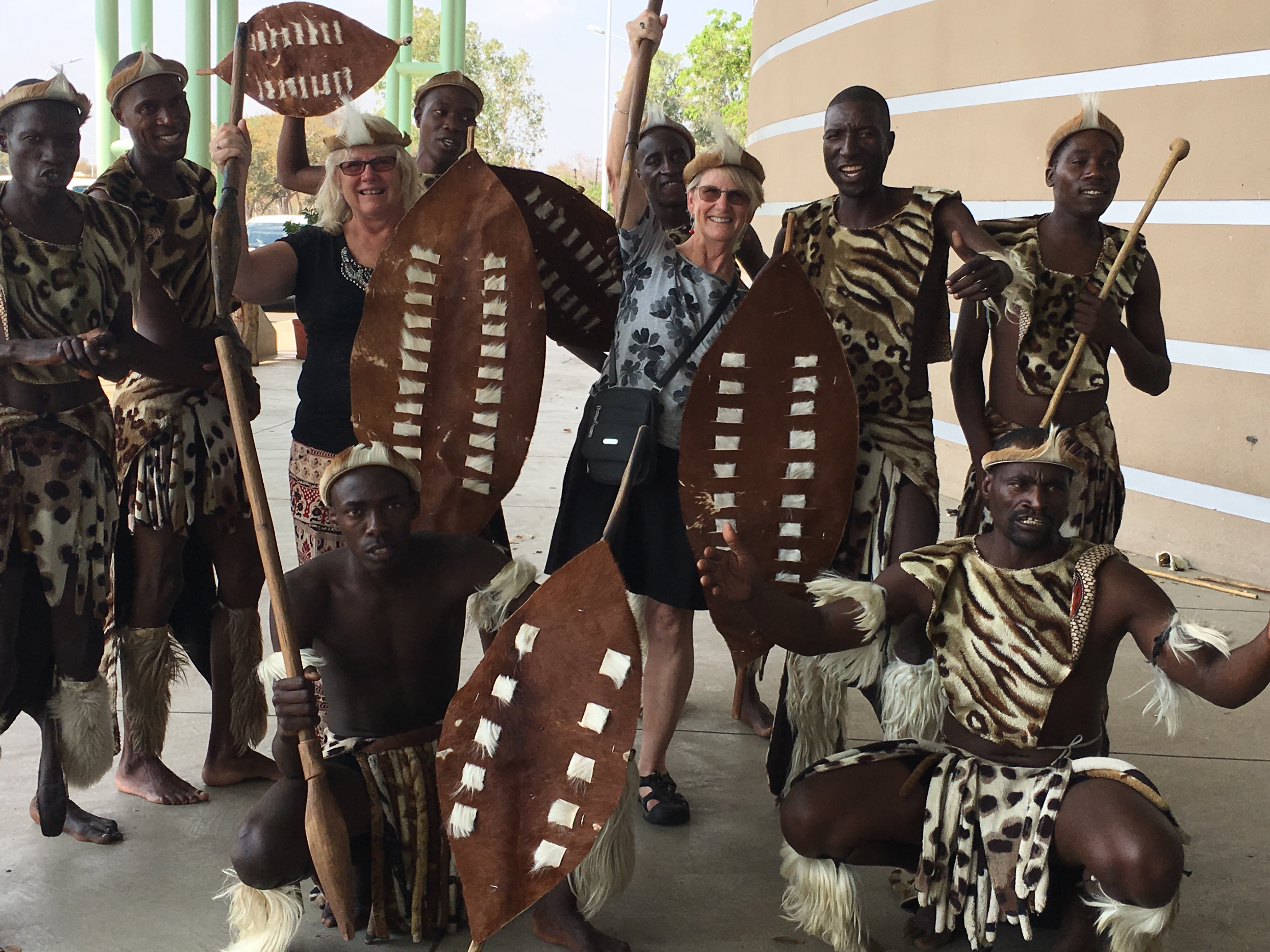 Up in the morning, but a bit later than our recent 0500 wake ups, we dressed and headed down to breakfast. The place was packed and crazy busy, but we managed to negotiate our way through the buffet and with the help of multiple cups of coffee we were ready to head back to the airport. Check in went remarkably easy as did going through the customs VAT queues for our tax refunds. Our flight ( #7) was delayed about an hour, but otherwise went fine. We landed at Victoria Falls, Zimbabwe and proceeded through the gauntlet. Once we deplaned we were handed an immigration form. Have no idea why they didn’t hand them out on the plane to have us complete them before landing, but hey, not everyone is as efficient as I think they ought to be. We stood along the way and completed the forms then had to speak with an immigration guy to let him know we were only entering the country once so needed only a single entry visa. We got in line and waited. And waited. Finally we got up to the desk to discern the length of the wait. Lots of beurocracy. Lots of writing. And stamping. Fee paying. Finally through, with bags there and happily our driver awaiting us. As we exited the airport Dana and I paused for a photo op with a group of local gentlemen. We then climbed into the van and off we went.