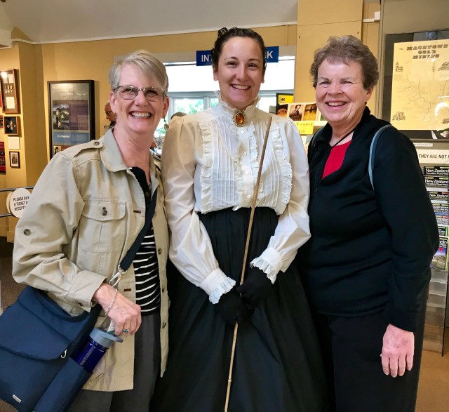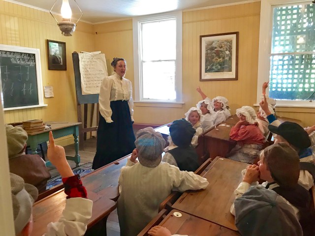 We began strolling along the small town and came upon the museum. We saw that the senior admission began at age 65, so I mentioned that I would be turning 65 next month while in the country so the clerk smiled and said “happy birthday” and gave me the discount. Yay again. It was a nicely done museum telling the story of the town and the mining, but there was one thing that charmed us the most… we came across a group of 4th grade students from the Clyde School who we found in a classroom replica, all clad in period clothes and hats and with a costumed teacher leading the “class”. What a great way to bring history to life for those children! They were totally engaged. Just before we left the museum the “teacher”, Miss Grey, came past us so of course we let her know how wonderful we thought the classroom was. We asked for a picture and she said “Do you want smiling Miss Grey or grumpy Miss Grey?” We opted for the former. Later on we came across the kids sitting outside eating their lunches so we took the opportunity to chat a bit. They loved the play acting especially where one had to pretend to be caned.