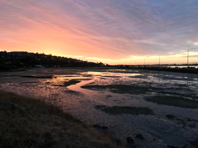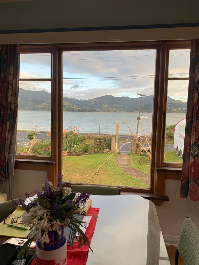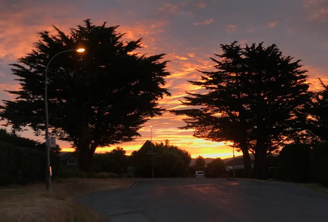 We drove for over 5 hours, some along the coast and much inland, as the topography changed gradually to more flat land, but still mostly rural farms. We stopped in the town of Ashburton as I knew it was the home of Ashford looms and spinning wheels. Thought I’d poke around a bit, which we did, but it was rather disappointing. We finally arrived in Christchurch at the home of our first Affordable Travel Club hosts. This is a group I joined for those over 40 who like to travel and meet people but are also willing to share their home. We’re fortunate to be staying with Pam and Rod in their gorgeous home up in the hills over looking the city. After settling in and chatting a bit we headed out for dinner. We went to an Indian restaurant that they recommended. We barely sat down and Dian asked the couple at the next table what they had eaten and enjoyed. That began about a 20 minute comedy stand up from the guy. Most amusing. On the way back to the house we were rewarded with a lovely sunset.