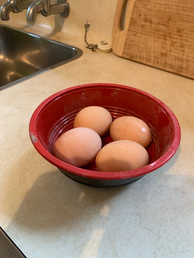Our delightful home owner had mentioned that she would come by in the morning and get us some fresh laid eggs from her chickens and sure enough as I was standing at the kitchen sink she came through the garden and waved. Soon after she knocked on the door with 4 eggs! The first we’ve had since arriving. So after our usual yogurt and fruit we had a treat of “happy chicken” scrambled eggs. Yum.