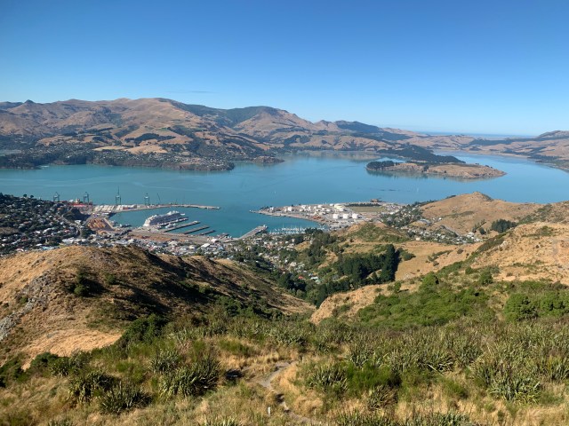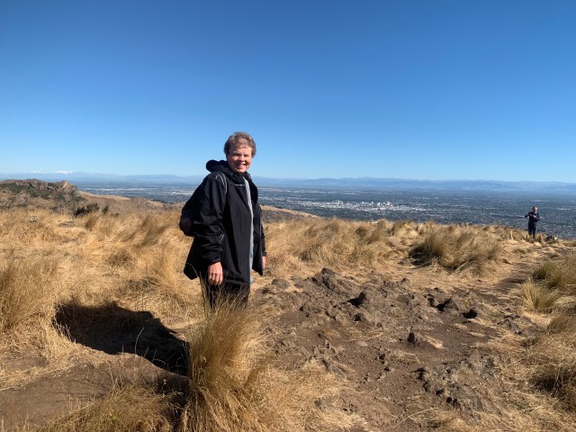 After chatting, exchanging travel stories and advice about how to spend our day we were off and about. We began by driving the short distance to the Christchurch gondola. Unlike Queenstown we found easy parking and no lines. We chose to get a package deal covering the gondola, the city tram, boat punting and the botanic gardens. We began by climbing into the gondola and riding up to the top of Cavendish Bluff. It gave us a striking view of the city and harbor. We were able to walk out onto the edge of the Bluff for a better view. After walking all around we went to the lower level where we rode a short “time travel” ride going over the development of New Zealand. More for children but still informative for all.