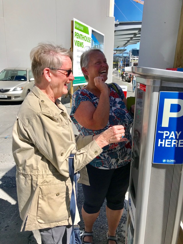 We then managed to drive into the center of the city and found a parking lot to leave the car. So much for the easy part. As we pulled up another car did the same and a woman got out to read the sign. We asked if she knew the routine. Nope. So we figured we’d learn together. Over to the pay machine. Unfortunately our credit and debit cards did not work and the only cash it took was coins. Well, silly me, I’ve continuously tried to lighten my load by using them. We needed $10 NZ and only had $9. But karma was on our side as the other woman was a sweetheart from Switzerland who gave us the dollar coin! The machine was rather touchy making you push in one coin then wait before another could be put in. I told the woman we wouldn’t be experiencing that if the machine had been made in Switzerland.
