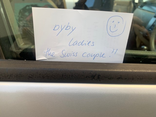 Further walking took us back to our car park. We were wondering if the nice Swiss couple had returned or not, as we had seen them several times throughout the day as we wandered around. Their car was gone but I found the sweetest note tucked into my car window saying “byby ladies, the Swiss couple”. It doesn’t get cuter than that.