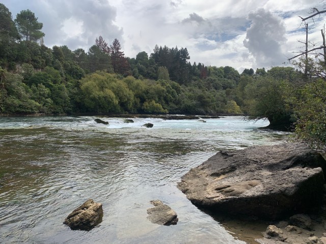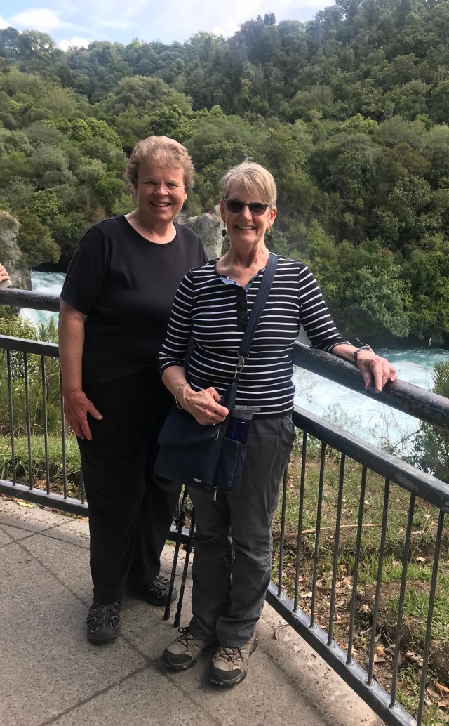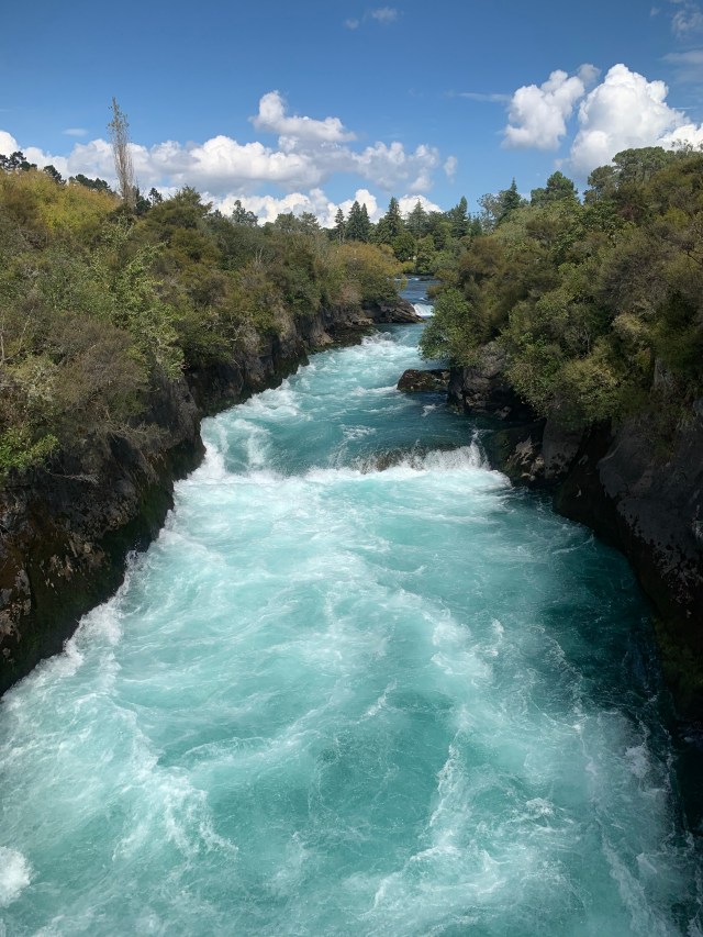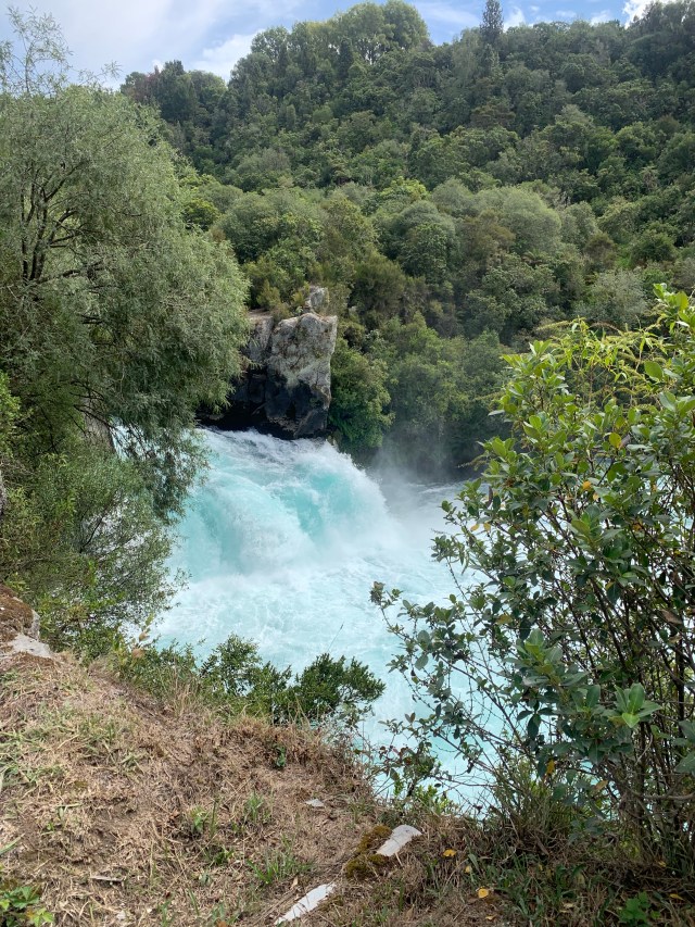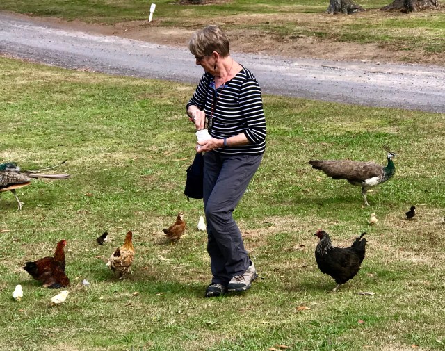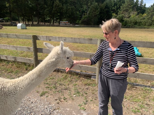 Eventually we came out of the mountains and round a bend there was Lake Taupo! It’s the largest lake in the country having been made from a volcano that exploded ages ago. We found a lovely, quiet spot on the lake to sit and enjoy lunch. Afterwards we drove thru the town but thought it looked much too touristy for our liking. We kept going. Barely 4 miles out of town we came upon Huka Falls, that Dian’s friend Terry (whom we met in Nelson) recommended we stop to see. It was a worthy stop! The falls were gorgeous. There was also a nicely done, easily walkable path along the river. We met any number of folks to chat with. Well, after all, our last host referred to us as a “friendly, chatty pair”! We drove on just a short way when I saw a sign for coffee. Screech! On with the brakes, a quick left turn and onto a long, gravel road we went. When it appeared that I had made a totally wrong choice, it suddenly became right! Into this odd little spot where were first came across a few alpacas, then peacocks, then a number of chickens with broods of chicks following along, then a friendly dog. Whoa! Definitely critter day! I did get a nice cup of coffee, plus the owner gave me pellets to feed the chickens and alpacas. What fun!