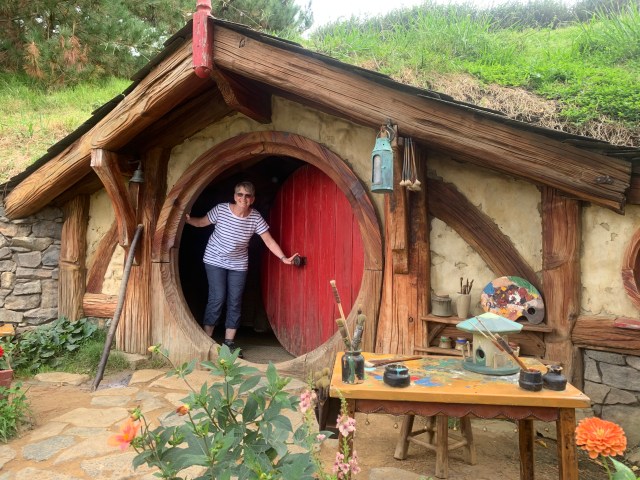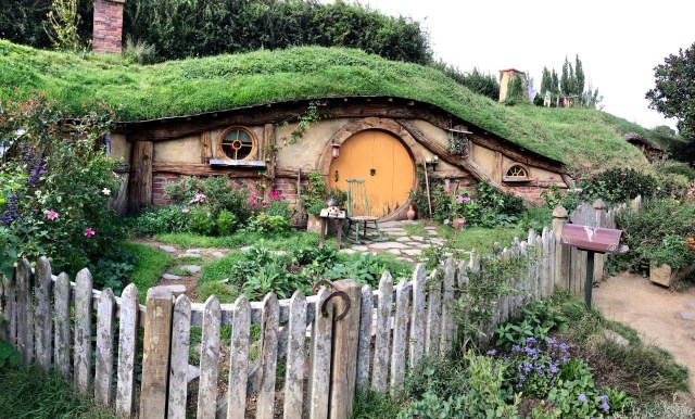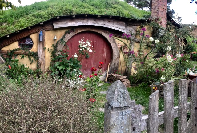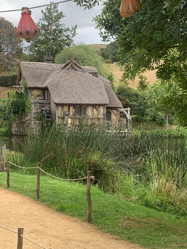Once we got ourselves moving we heading out for Matamata, the town near Hobbiton. It was only a 45 minute drive, but we were on a very narrow, very winding road for miles, with no signs confirming we were heading in the correct direction. I was getting worried and started fussing that perhaps I had entered the wrong address for Siri, when finally a sign appeared. We had to report in at The Shire, which we did though we were early. Once again, as luck would have it, they asked if we wished to go early. Well, yes! Within 15 minutes we boarded a bus for a short ride over to Hobbiton. When the Trilogy was filmed they had built the sets but did not make them permanent. When later they came to film the Hobbit they decided to make them a permanent thing, with the permission of the farming family who owned the land. We were led around all the different hobbit holes, about 40 different ones, being told some of the story and the background about the building of them. Above Bilbo’s house they had to build a fake tree that has over 200,000 leaves attached! We were given the opportunity for pictures galore ending up at the Green Dragon where we were offered either beer or ginger beer.