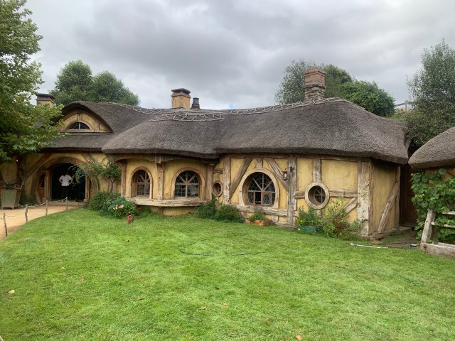Once we got ourselves moving we heading out for Matamata, the town near Hobbiton. It was only a 45 minute drive, but we were on a very narrow, very winding road for miles, with no signs confirming we were heading in the correct direction. I was getting worried and started fussing that perhaps I had entered the wrong address for Siri, when finally a sign appeared. We had to report in at The Shire, which we did though we were early. Once again, as luck would have it, they asked if we wished to go early. Well, yes! Within 15 minutes we boarded a bus for a short ride over to Hobbiton. When the Trilogy was filmed they had built the sets but did not make them permanent. When later they came to film the Hobbit they decided to make them a permanent thing, with the permission of the farming family who owned the land. We were led around all the different hobbit holes, about 40 different ones, being told some of the story and the background about the building of them. Above Bilbo’s house they had to build a fake tree that has over 200,000 leaves attached! We were given the opportunity for pictures galore ending up at the Green Dragon where we were offered either beer or ginger beer.