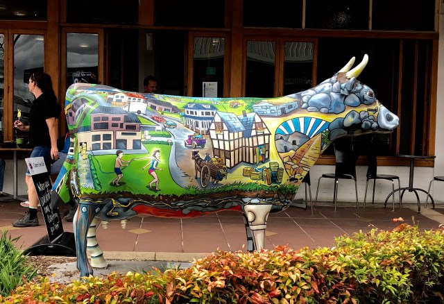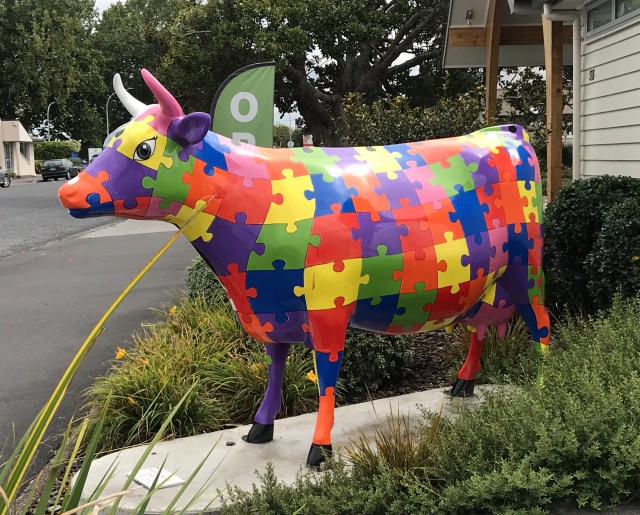 We drove on, heading for Thames at the base is the Coromandel Peninsula, our stop for the night. Along the way, going through a small town, Dian called out “There’s a cow!”. Now that shouldn’t be an unusual thing in the land of sheep and cattle. But this was no ordinary cow. This was a painted cow on the street corner. Back in Nelson when we met Dian’s friend Terry, he told us to be on the lookout for the “cow town”, but he couldn’t remember the town’s name. He just said “You’ll know it when you pass through”. He was right! We hooted with glee that here it was in Morrinsville. Now there were many roads we could have taken today so we were just lucky to have selected this one. We putzed along as slowly as traffic would allow with Dian, my ace photographer snapping pictures. When I could I pulled over for her to get out for better shots. They were most amusing. I don’t know the story behind them, but we enjoyed them nonetheless.