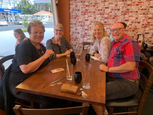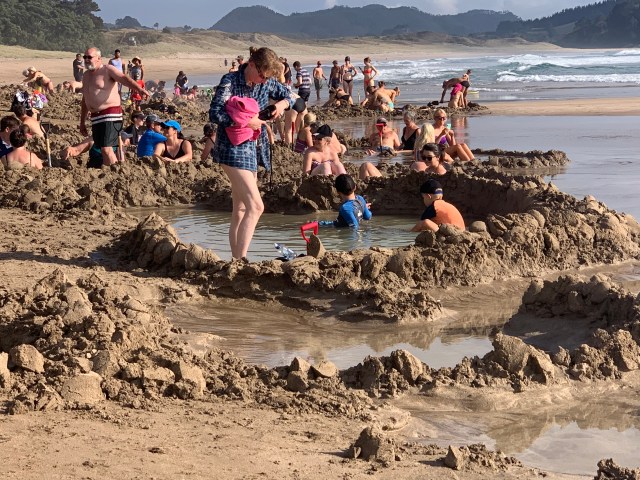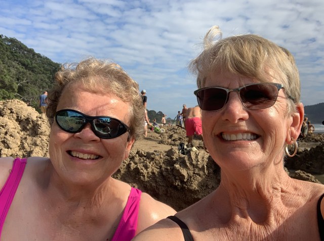 Now this is no ordinary beach. It is just what its name implies, as the beach lies over a hot springs. One must go between two hours before and no more than two hours after low tide. Before we left Thames we had made a quick stop at the i-site for information on the peninsula. The young woman there was kind enough to fill us in on the tide schedule so we knew when to arrive. We shed our clothes and wandered down onto the beach where we were met with sand as soft as silk. We could see where we needed to head as everyone there was congregated in one area. You must bring or rent a spade (our hosts were kind enough to lend us one) as the thing to do is to go down by the water’s edge, dig a pool in the sand and allow it to fill up with water from underground. It comes up surprisingly warm and in some places very hot. Then, once you have a pool you climb in and soak like in a hot tub. How cool is that? Luckily for us beach goers come and go. We found an abandoned pool and tried it out. Fairly good but only barely luke warm. Then, a young family decided to leave the next pool over, which was larger and warmer and they asked if we’d like to take it over. Well, yes, thank you! It was heavenly. We had settled in to our personal little space when an older couple approached and asked about the lay of the land. We clued them in. They began to dig a hole for themselves, but even using our shovel as well as their own they didn’t make much progress. Instead we invited them to join us in ours. A lovely couple from York, England.