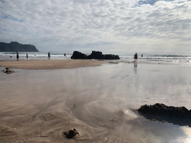 We both had a wonderful night’s sleep in this cute cottage. We had bit of breakfast then slipped on our bathing suits with clothes on top and headed out about 8:30. Today’s calendar had a visit to Hot Water Beach first and foremost. A half hour’s drive had us arriving at the beach, finding the car park and actually being able to figure out the pay stand.