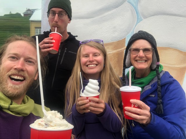 We had quite a bit of driving ahead of us, so we skeddaddled along, though we couldn’t resist stopping along the road when we saw a river running through a small canyon. Eventually we reached Akureyri, the city that is considered the capital of the north. We were totally charmed to find that their red stoplights are in the shape of a heart! We first stopped at the Bonus grocery store to stock up, including some much needed prunes after three days of travel. Next was gassing up Kuku …. that’s quite a shocker at the pump with a vehicle with a large tank and gas is rather pricey. While we had been driving we were listening to some podcasts about Iceland and heard about an ice cream shop in town that actually had vegan ice cream! Once Mandy heard that we had to find it. We wended our way through town, discovering the ice ream shop on a side road. In we went and much to our delight we found soft ice cream with multiple choices for add-ins. We each found something that sounded delicious, but boy oh boy, we weren’t expecting such large portions. Somehow we managed.