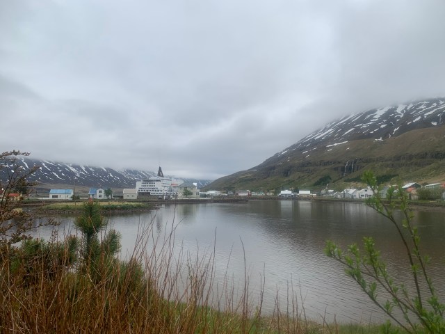 The morning got off to a relative late start as we had stayed up for the kids to watch the show finale. After breakfast we walked around the charming town, surrrounded by mountains and waterfalls and directly on the fjord. This is the port where a ship sails in from the Faeroe Islands, Norway and Denmark. That explains why so many of the camper vans were from Germany. Nothing was open during our walk around but we enjoyed seeing the rainbow walk and all the colorful houses. None are large, but they are well kept and seem quite suited to the place.