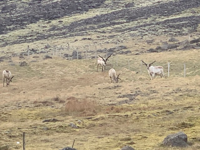 As we were blithely driving along all of a sudden we saw other animals off to the side of the road up against the base of the mountains. Turned out that they are wild reindeer! After that first group we saw a number of other groups as we drove along. Apparently, it never became worthwhile to raise them, so they are only found wild in this part of Iceland.
