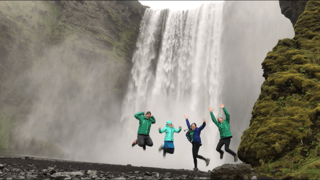 Continuing the drive we came upon Skogafoss, another spot featured in Game of Thrones involving a dragon that Jon Snow rode. But that wasn’t key for me. What was important was that it was obviously a gorgeous waterfall but there was a huge staircase next to it leading up to the viewing platforms. Hmmm…..at times I might have said “Forget it. I’ll wait for you down here”. But now? After walking for over 5,500 miles in the past three years I figured I should go for it. So off we went, with me counting the stairs. Luckily Kevin was walking behind me to ensure I safely made it up. Along the way another older woman had paused to rest, looking rather beat, but wasn’t ready to give in. She wanted to chat, but Kevin knew I’d lose my count, so he mentioned that we’d tell her at the top what she’d managed. Up we went, all 427 steps, to see the gorgeouus view. We continued along the path a bit further and saw two more waterfalls. But sometimes these kids about give me a heart attack with how close to the edge they’re willing to be. I just can’t watch.