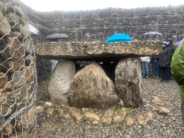 Our next visit was nearby at the Carrowmore Megalithic Cemetery, one of the largest Stone Age cemeteries in Europe. It has stone circles, passage tombs and dolmens thought to predate Newgrange, which we saw when we first arrived. We happened to arrive as they were about to begin a tour in English, so we jumped in. The guide was amazing! It was like listening to the best history professor ever, telling the story of the place and people and age when it was all created. He truly brought it alive. We listened indoors for quite some time before waking out to see the site, as it was pouring rain. Lots of raincoats and umbrellas and we were off! We stopped at the main reconstructed cairn and could walk into the center, where it had been situated to get direct sunlight at dawn on each October 31st. Upon leaving we were amazed to run into Jean, a Frenchman we met at the hostel at Mt Errigal.