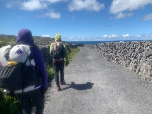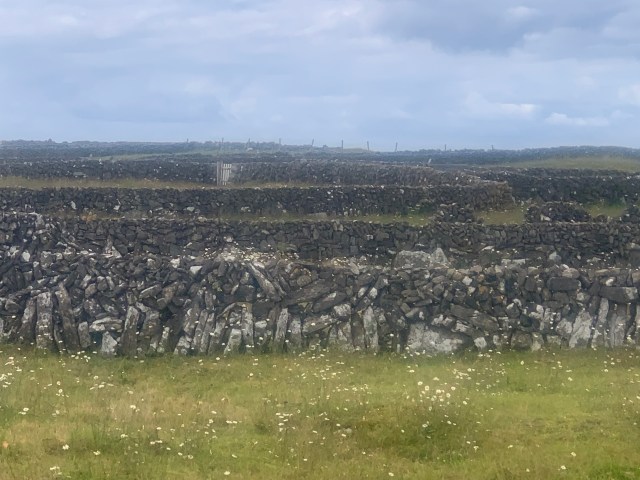 They returned sooner than I expected, turned in the bikes and we all walked over to the pier to await the return of the Happy Hooker. She came in right on time at 1130. We boarded, speaking with the deck hand to make sure they knew we wanted to alight on Inishmaan, the middle of the three Aran Islands. It wasn’t a long ride before we were there, with only two other passengers getting off with us. It’s a rather bleak and desolate feeling compared to the other islands. We began walking up from the pier when a gentleman in a van pulled up and asked if we wanted a taxi to the village. The kids looked at me, I looked at the road and hill and said yes. €15 later he dropped us at the far end and pointed. “The cliffs are over there”. Ok.