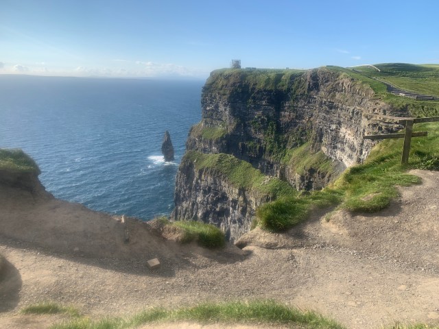 It was to the famous Cliffs of Moher we went. We had an unusual good weather window, with the sun we had this morning showing back up here. Plus, we find that if we go to the major tourist attractions later we avoid most of the people. It was so this evening. Not many visitors, but great views even as we were being blown around by the strong wind. We walked along the cliff a bit admiring the view, watching the cliff birds soar on the wind. We later went into the visitor center and learned more about the area, including the geology, the flora and fauna. They also had a short video that was a mini version of an Imax showing the cliffs and the waters around it. Made me dizzy watching it.