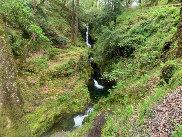 Once back up the 350 stairs we drove on, heading for the Wicklow Mountains National Park. We crossed the mountains over the Wicklow Gap and made our way to Glendalough, the Glen of the Two Lakes. We found parking by the upper lake and walked over to enjoy the view. The lakes are in a lovely valley, which also gave us an opportunity to see a waterfall across the valley as well as another one we could walk up a short path to see.