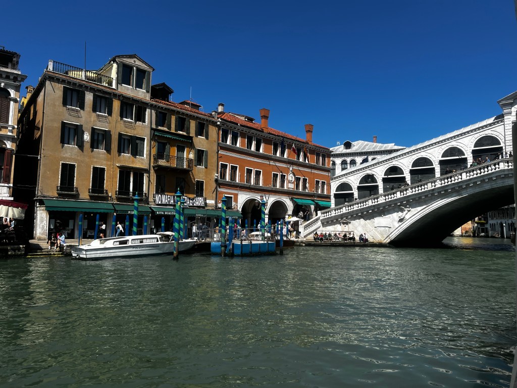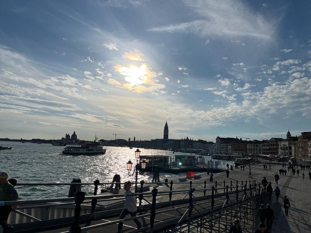 We exited the train, walked out of the station and voila! There was Venice, the Grand Canal. Our first order of business was to buy 3 day passes for the Vaporetti, the water taxis. Once we had them in hand the next thing was to figure out which spot to go to to get on the correct one to take us nearest to the hotel. I knew from corresponding with the hotel from home that it should be the ACTV 1 or 2. We had to wait in a rather crowded queue for about 20 minutes, jostling around with everyone and their bags, including ours. It makes us happy that we packed so light that we each have only a small roller bag and a backpack. Eventually we got squished on board and were on our way. Luckily as we made stops the crowd thinned making it much more pleasant.