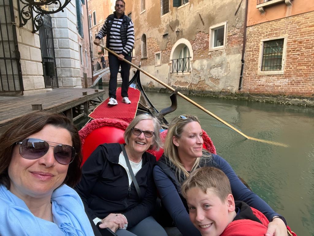 Even though we had spent much of the day on the water we saved what I consider the best for last. We had our gondola ride! Something I didn’t get to do when I was here as a teenager. We went to the nearest gondola spot, but soon Jayne was up to something- she was off talking with the gondoliers and then she and Silas ran off. Hmmm. They returned shortly and we climbed into the next available gondola, but she and Gulgun had a surprise for me – they hired a musician to play for us while we were boating! Oh, the joy! It was magical! The guitarist played beautifully and at times the gondolier sang, but not well. However, he whistled well. I mentioned that he ought to stick with that. He was quite the character and called out to all the other gondoliers as we passed by. All too quickly it was over.