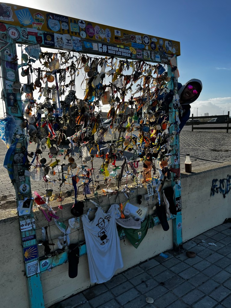 It was at that same spot we found a directional sign happily pointing the way to Santiago as well as many other world cities. Plus, even more fun was a grid of stuff hanging from all sorts of hikers. Karma put one of their stickers on it.