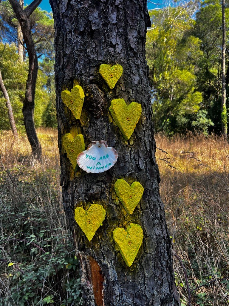 But the most charming thing today was the path leading up to the town of Fão, where we are staying. It was lined with inventive decorations related to the Camino with lots of positivity. Delightful.