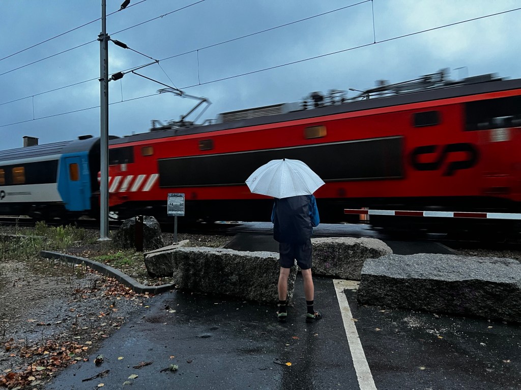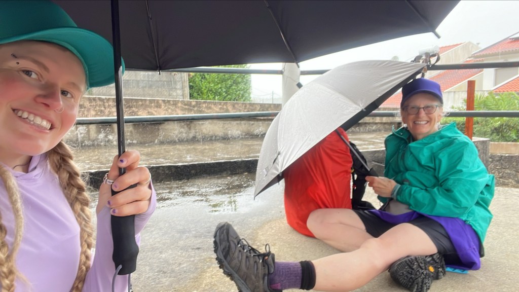 This morning we wanted to get moving as we knew a major weather system was coming, so we hoped to walk a bit before the rain began. No such luck. It was already misty and then the rain began. Out came our umbrellas. Fortunately we already had on our shells and pack covers. And guess who joined us? The same dog who followed us yesterday. His saga continues. Matilda had tried to get the Caminha rescue group to pick him up but he disappeared. And now, here he was!