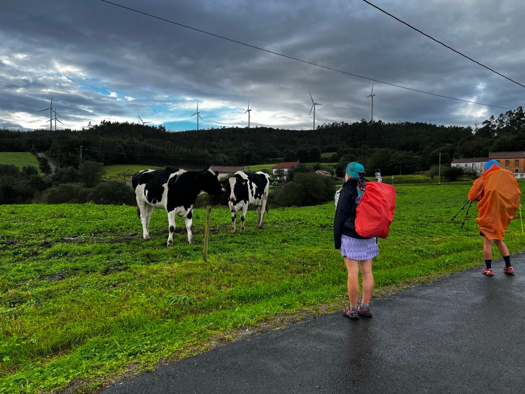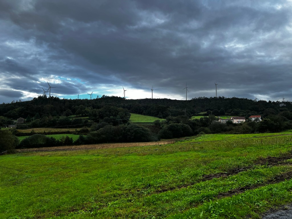 And then it turned nicer. Not sunny, but not raining. Pleasant. Which was good since this was going to be the longest walk I’d do to date. But then I saw windmills up on the ridge. Geez. Not again! When we hiked the Primitivo I knew every time we saw them it meant another uphill. Same here. Somehow I didn’t recall this area having all these hills. Probably better that I didn’t remember.